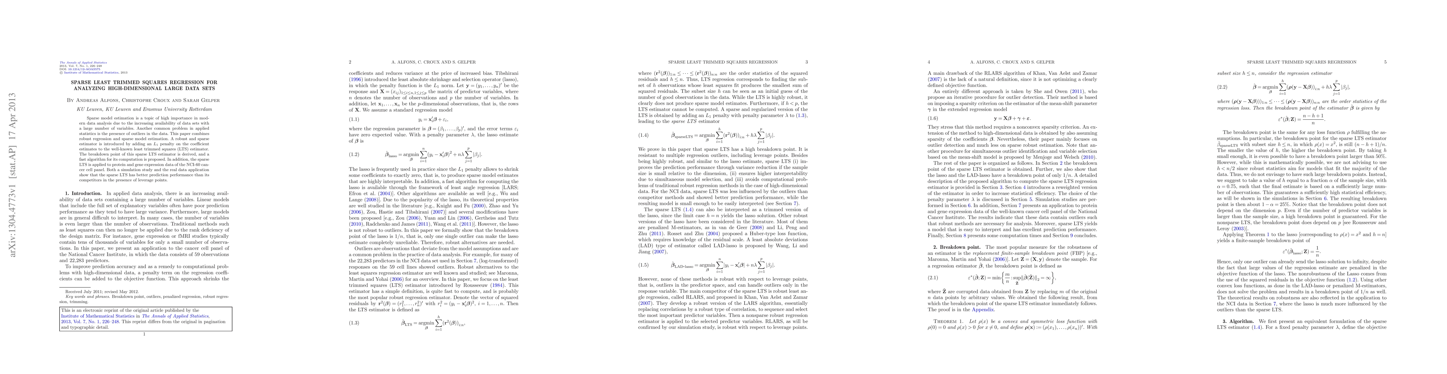 This paper introduces a robust sparse least trimmed squares (sparse LTS) regression method combining sparse model estimation with robust regression to handle high-dimensional data with outliers. The proposed method outperforms competitors in prediction accuracy, as demonstrated through simulations and applications to cancer cell gene expression data.