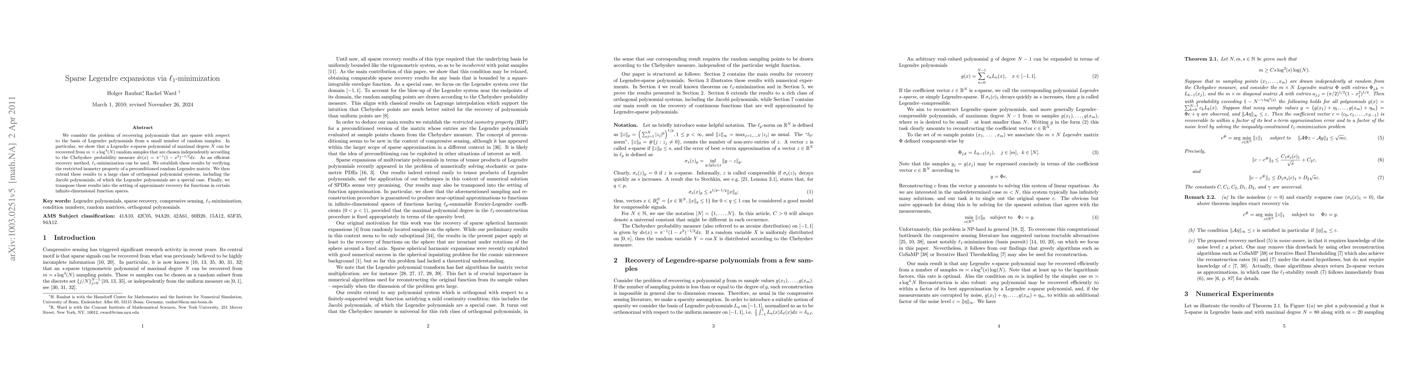 Researchers developed a method to recover sparse polynomials using Legendre expansions via $ extit{l}_1$ minimization, achieving accurate recovery with a small number of random samples.