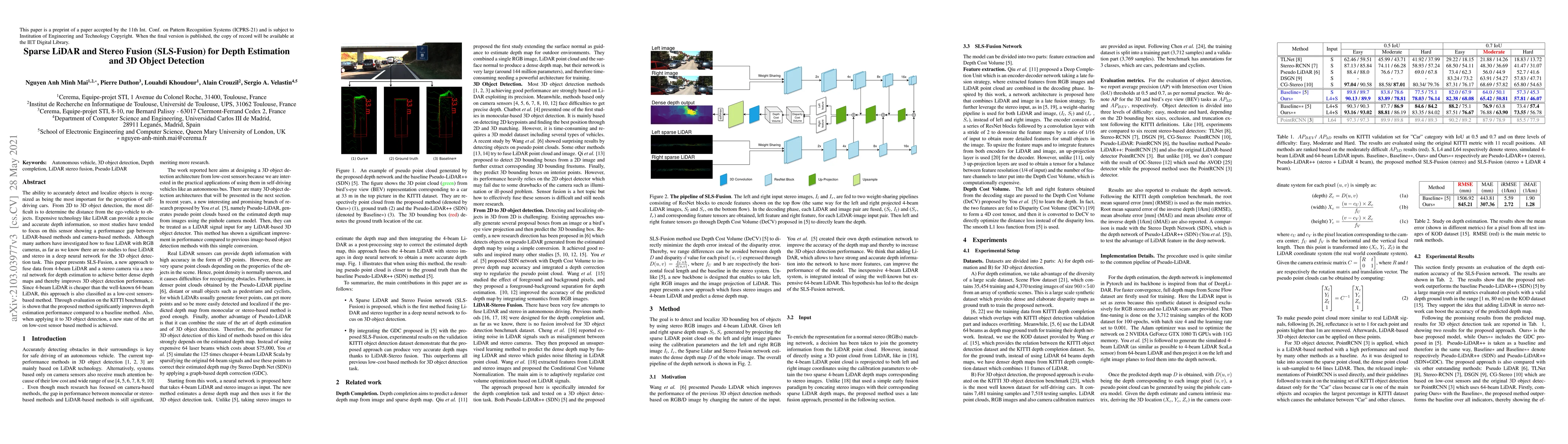 This paper introduces SLS-Fusion, a method that combines sparse LiDAR and stereo vision data through a neural network to enhance depth estimation and improve 3D object detection for self-driving cars. The approach uses a cost-effective 4-beam LiDAR instead of expensive 64-beam LiDAR, achieving state-of-the-art performance on the KITTI benchmark.