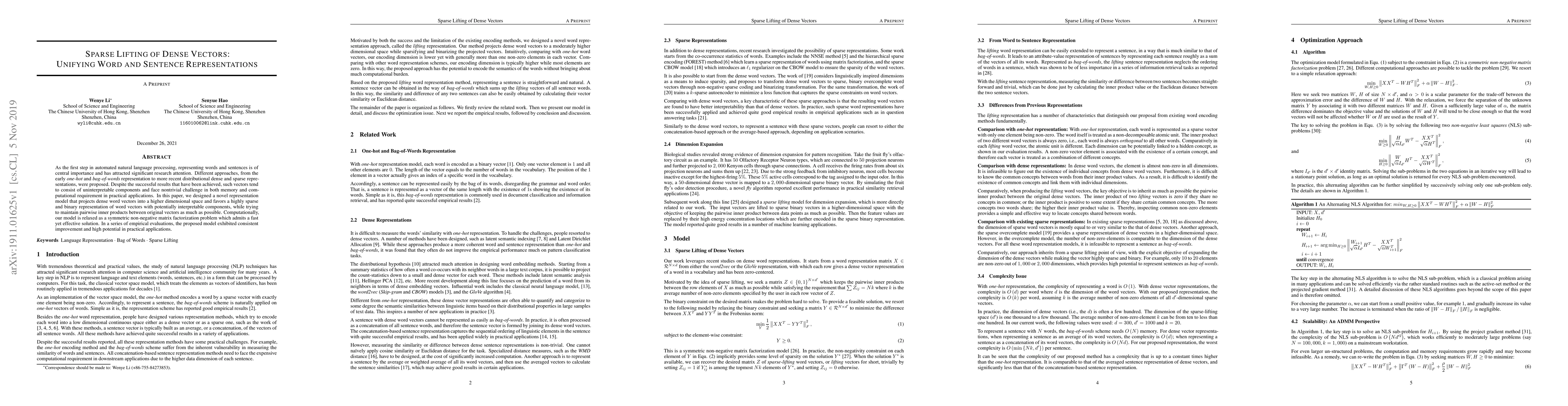 As the first step in automated natural language processing, representing words and sentences is of central importance and has attracted significant research attention. Different approaches, from the early one-hot and bag-of-words representation to more recent distributional dense and sparse representations, were proposed. Despite the successful results that have been achieved, such vectors tend to consist of uninterpretable components and face nontrivial challenge in both memory and computational requirement in practical applications. In this paper, we designed a novel representation model that projects dense word vectors into a higher dimensional space and favors a highly sparse and binary representation of word vectors with potentially interpretable components, while trying to maintain pairwise inner products between original vectors as much as possible. Computationally, our model is relaxed as a symmetric non-negative matrix factorization problem which admits a fast yet effective solution. In a series of empirical evaluations, the proposed model exhibited consistent improvement and high potential in practical applications.