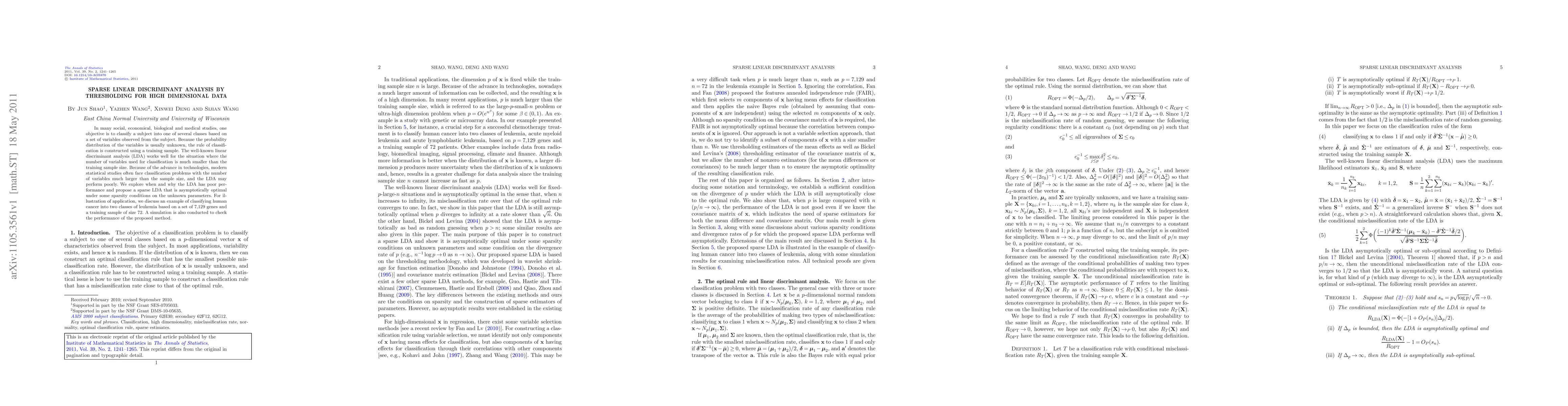 In many social, economical, biological and medical studies, one objective is to classify a subject into one of several classes based on a set of variables observed from the subject. Because the probability distribution of the variables is usually unknown, the rule of classification is constructed using a training sample. The well-known linear discriminant analysis (LDA) works well for the situation where the number of variables used for classification is much smaller than the training sample size. Because of the advance in technologies, modern statistical studies often face classification problems with the number of variables much larger than the sample size, and the LDA may perform poorly. We explore when and why the LDA has poor performance and propose a sparse LDA that is asymptotically optimal under some sparsity conditions on the unknown parameters. For illustration of application, we discuss an example of classifying human cancer into two classes of leukemia based on a set of 7,129 genes and a training sample of size 72. A simulation is also conducted to check the performance of the proposed method.