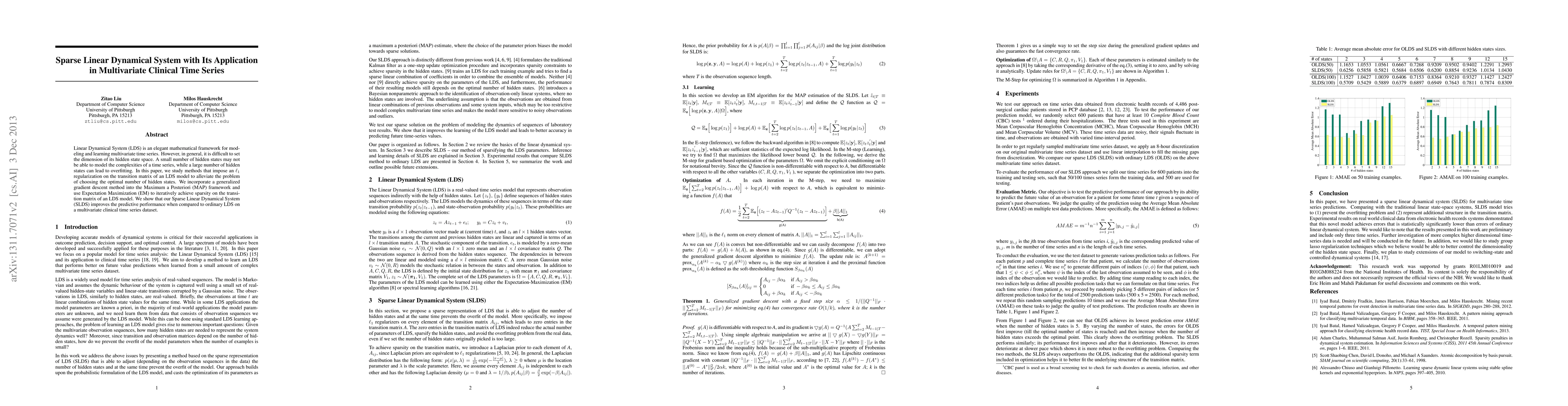 This paper proposes a Sparse Linear Dynamical System (SLDS) to address the challenge of determining the optimal number of hidden states in LDS models. By incorporating $\ell_1$ regularization and using an iterative EM algorithm within a MAP framework, the SLDS achieves sparsity and demonstrates improved predictive performance on a multivariate clinical time series dataset compared to traditional LDS.