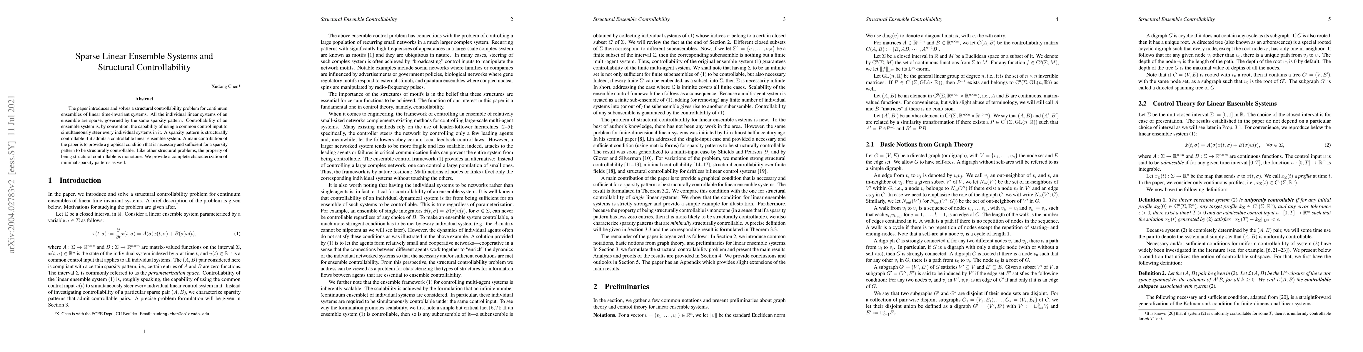 This paper explores structural controllability in sparse linear ensemble systems, offering a graphical condition necessary and sufficient for a sparsity pattern to support such controllability. It also characterizes minimal sparsity patterns that maintain this structural controllability.