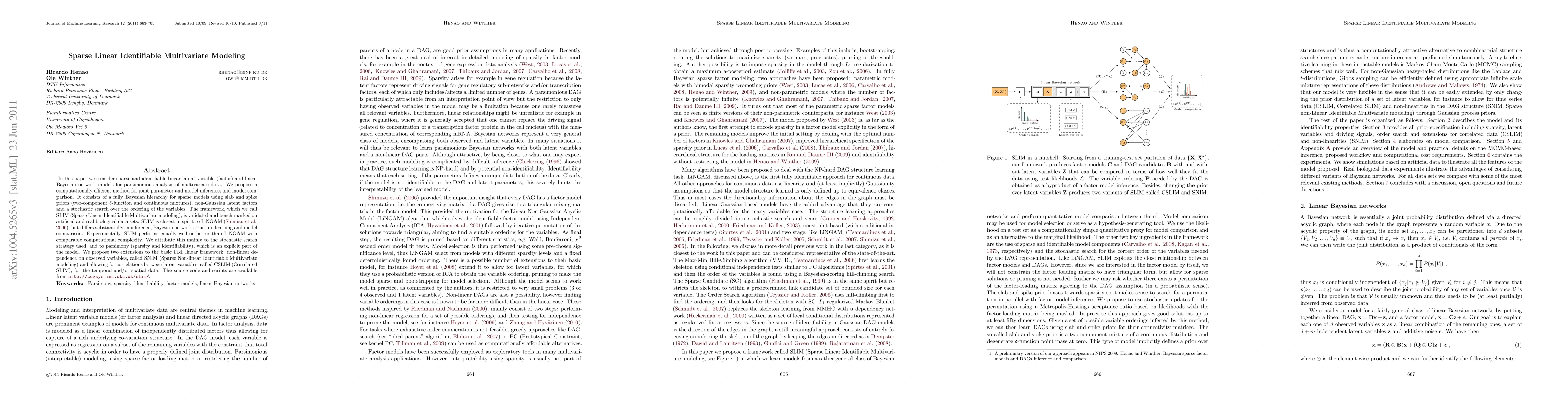 This paper introduces SLIM, a Bayesian framework for sparse and identifiable linear multivariate modeling, employing slab and spike priors for efficient joint parameter and model inference. It outperforms LiNGAM in performance and complexity, thanks to a stochastic search and explicit model parsimony. Extensions include SNIM for non-linear dependencies and CSLIM for correlated latent variables.