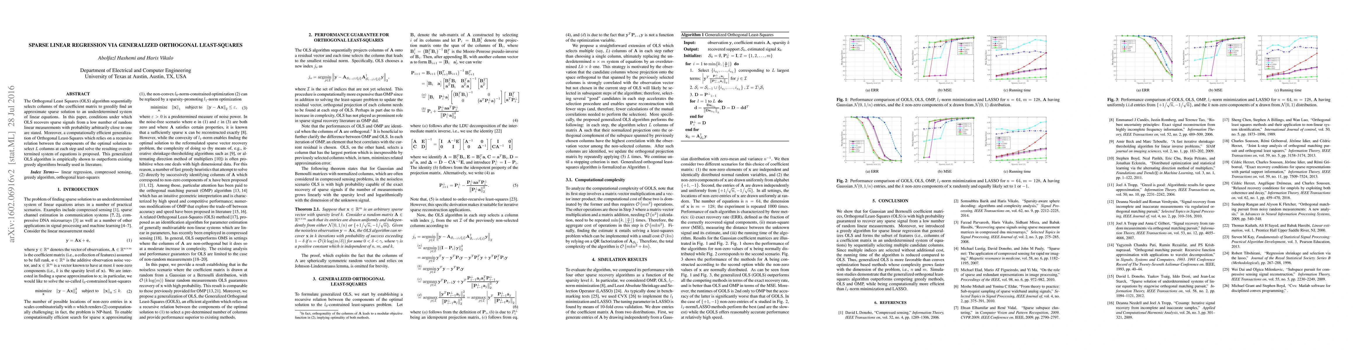 This paper proposes a generalized Orthogonal Least-Squares (OLS) algorithm for sparse linear regression to find an approximate sparse solution to underdetermined systems. The method outperforms existing greedy algorithms by recursively selecting features and solving overdetermined systems, leading to superior performance and computational efficiency.