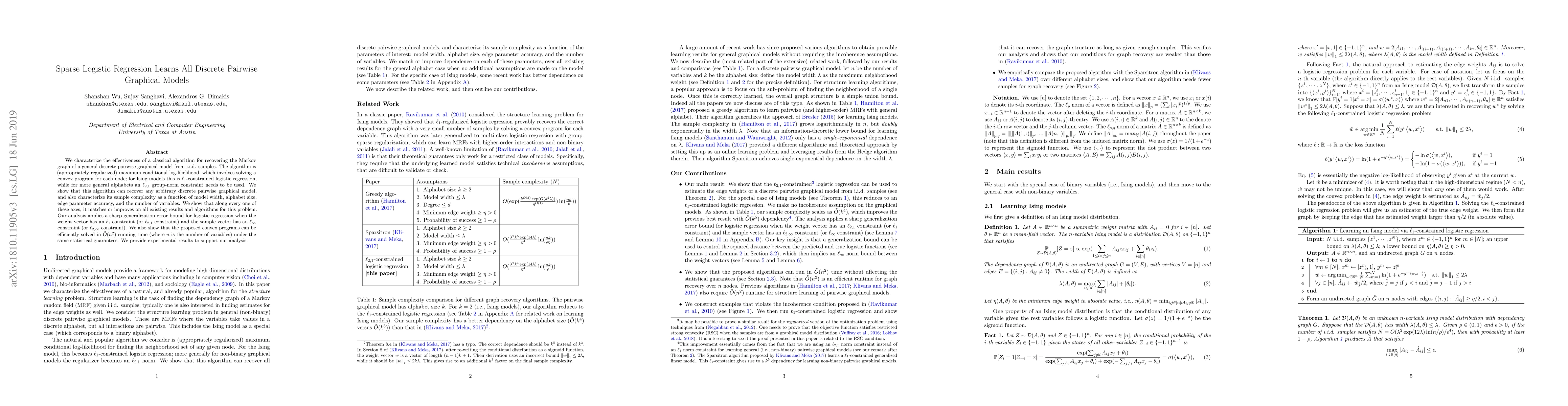 This paper demonstrates that a regularized maximum conditional log-likelihood algorithm, specifically $\ell_1$-constrained logistic regression for Ising models, can recover any discrete pairwise graphical model efficiently. It shows that this method matches or outperforms existing algorithms in terms of sample complexity and running time.