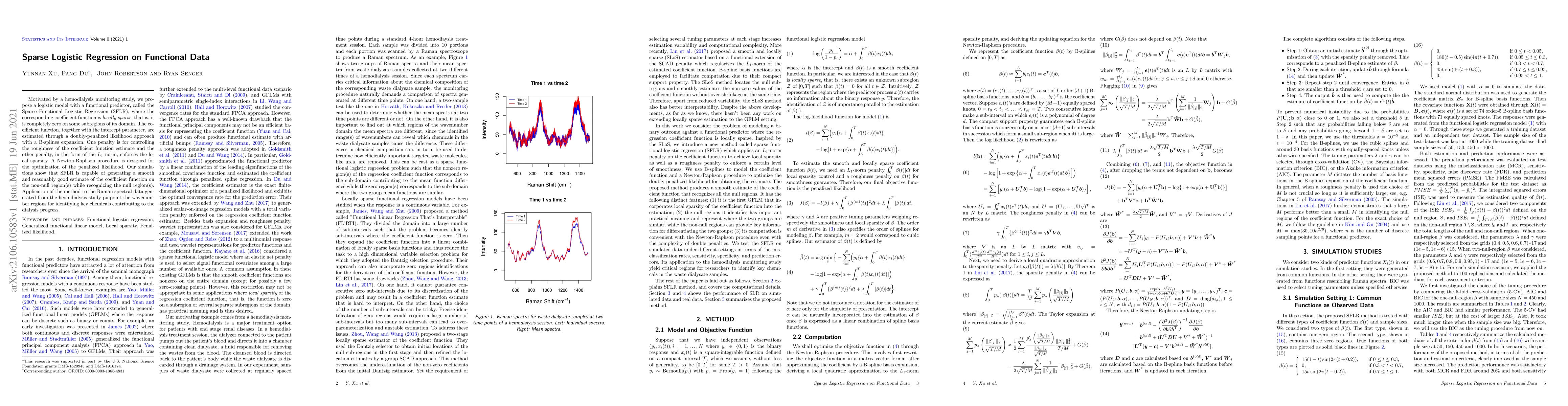 Motivated by a hemodialysis monitoring study, we propose a logistic model with a functional predictor, called the Sparse Functional Logistic Regression (SFLR), where the corresponding coefficient function is {\it locally sparse}, that is, it is completely zero on some subregions of its domain. The coefficient function, together with the intercept parameter, are estimated through a doubly-penalized likelihood approach with a B-splines expansion. One penalty is for controlling the roughness of the coefficient function estimate and the other penalty, in the form of the $L_1$ norm, enforces the local sparsity. A Newton-Raphson procedure is designed for the optimization of the penalized likelihood. Our simulations show that SFLR is capable of generating a smooth and reasonably good estimate of the coefficient function on the non-null region(s) while recognizing the null region(s). Application of the method to the Raman spectral data generated from the heomdialysis study pinpoint the wavenumber regions for identifying key chemicals contributing to the dialysis progress.