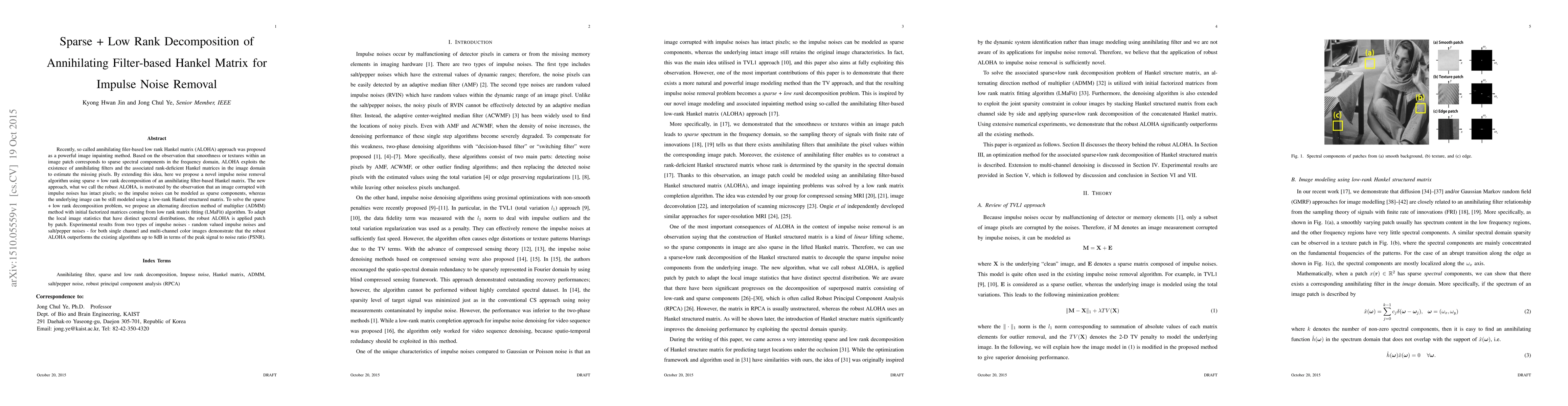 This paper proposes a novel impulse noise removal method using sparse + low rank decomposition of an annihilating filter-based Hankel matrix, called robust ALOHA. The method leverages the ADMM algorithm with initial matrices from LMaFit, applied patch-by-patch to adapt to local image statistics, and outperforms existing algorithms by up to 8dB in PSNR for both random valued and salt/pepper noise in single and multi-channel color images.