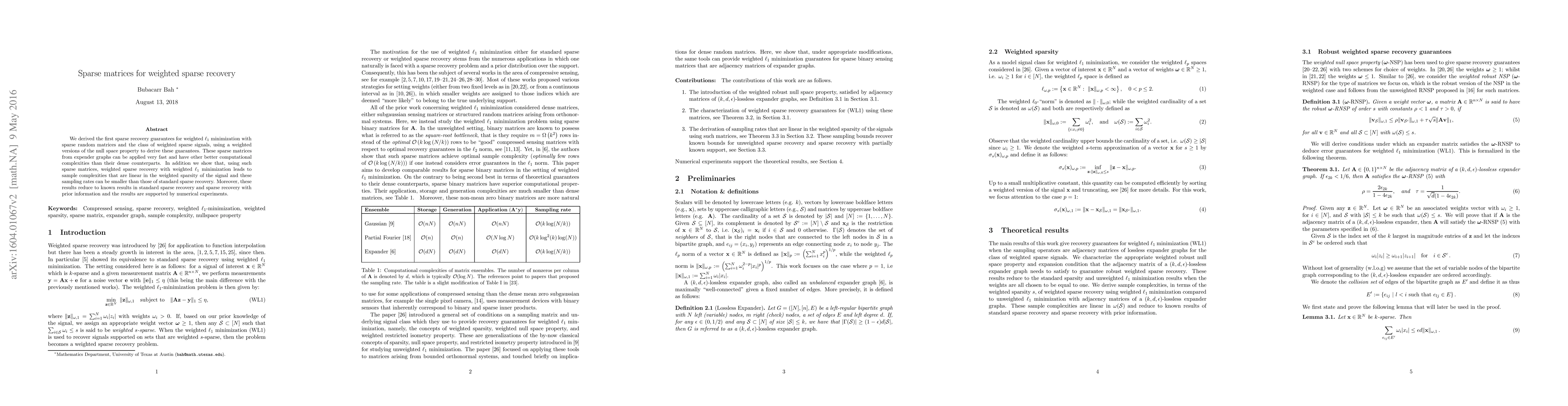 This paper presents sparse recovery guarantees for weighted $\ell_1$ minimization using sparse matrices derived from expander graphs, which offer faster computation and better complexity than dense matrices. The study shows that these matrices lead to sample complexities that are linear in the weighted sparsity, potentially smaller than those of standard sparse recovery methods, and are supported by numerical experiments.