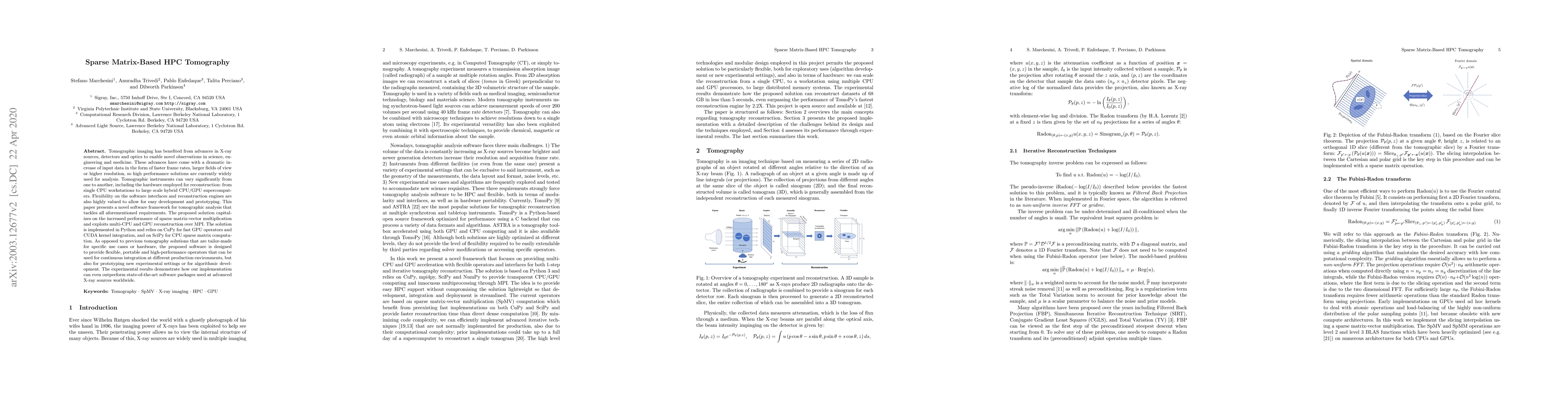 Tomographic imaging has benefited from advances in X-ray sources, detectors and optics to enable novel observations in science, engineering and medicine. These advances have come with a dramatic increase of input data in the form of faster frame rates, larger fields of view or higher resolution, so high performance solutions are currently widely used for analysis. Tomographic instruments can vary significantly from one to another, including the hardware employed for reconstruction: from single CPU workstations to large scale hybrid CPU/GPU supercomputers. Flexibility on the software interfaces and reconstruction engines are also highly valued to allow for easy development and prototyping. This paper presents a novel software framework for tomographic analysis that tackles all aforementioned requirements. The proposed solution capitalizes on the increased performance of sparse matrix-vector multiplication and exploits multi-CPU and GPU reconstruction over MPI. The solution is implemented in Python and relies on CuPy for fast GPU operators and CUDA kernel integration, and on SciPy for CPU sparse matrix computation. As opposed to previous tomography solutions that are tailor-made for specific use cases or hardware, the proposed software is designed to provide flexible, portable and high-performance operators that can be used for continuous integration at different production environments, but also for prototyping new experimental settings or for algorithmic development. The experimental results demonstrate how our implementation can even outperform state-of-the-art software packages used at advanced X-ray sources worldwide.