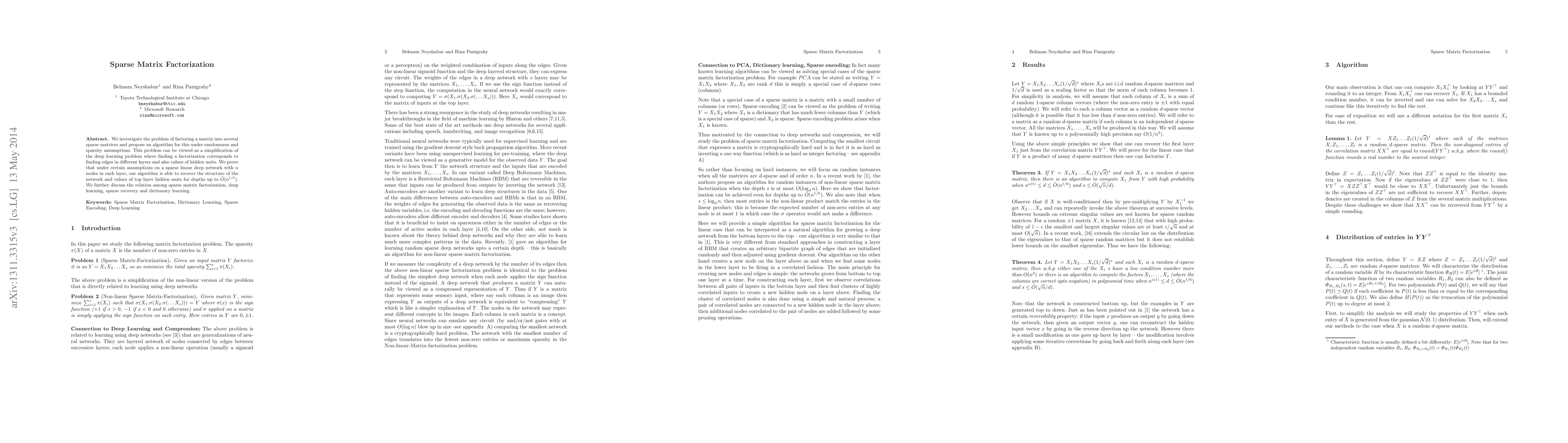 This paper proposes an algorithm for factorizing sparse matrices under randomness and sparsity assumptions, demonstrating its effectiveness for sparse linear deep networks. The algorithm can recover the network structure and top layer hidden units' values for depths up to $\tilde O(n^{1/6})$.