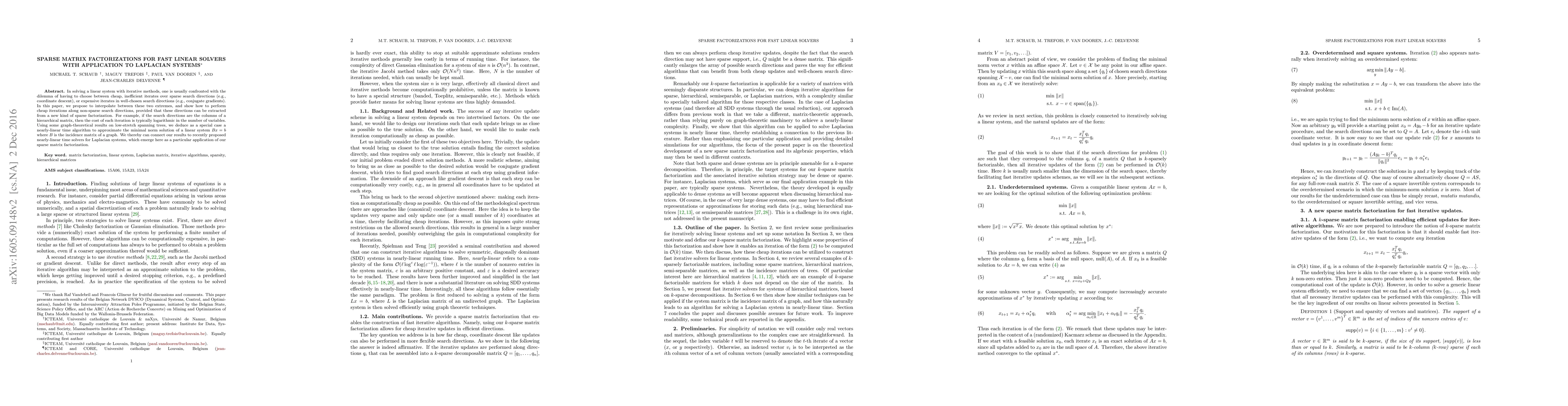 In solving a linear system with iterative methods, one is usually confronted with the dilemma of having to choose between cheap, inefficient iterates over sparse search directions (e.g., coordinate descent), or expensive iterates in well-chosen search directions (e.g., conjugate gradients). In this paper, we propose to interpolate between these two extremes, and show how to perform cheap iterations along non-sparse search directions, provided that these directions can be extracted from a new kind of sparse factorization. For example, if the search directions are the columns of a hierarchical matrix, then the cost of each iteration is typically logarithmic in the number of variables. Using some graph-theoretical results on low-stretch spanning trees, we deduce as a special case a nearly-linear time algorithm to approximate the minimal norm solution of a linear system $Bx= b$ where $B$ is the incidence matrix of a graph. We thereby can connect our results to recently proposed nearly-linear time solvers for Laplacian systems, which emerge here as a particular application of our sparse matrix factorization.