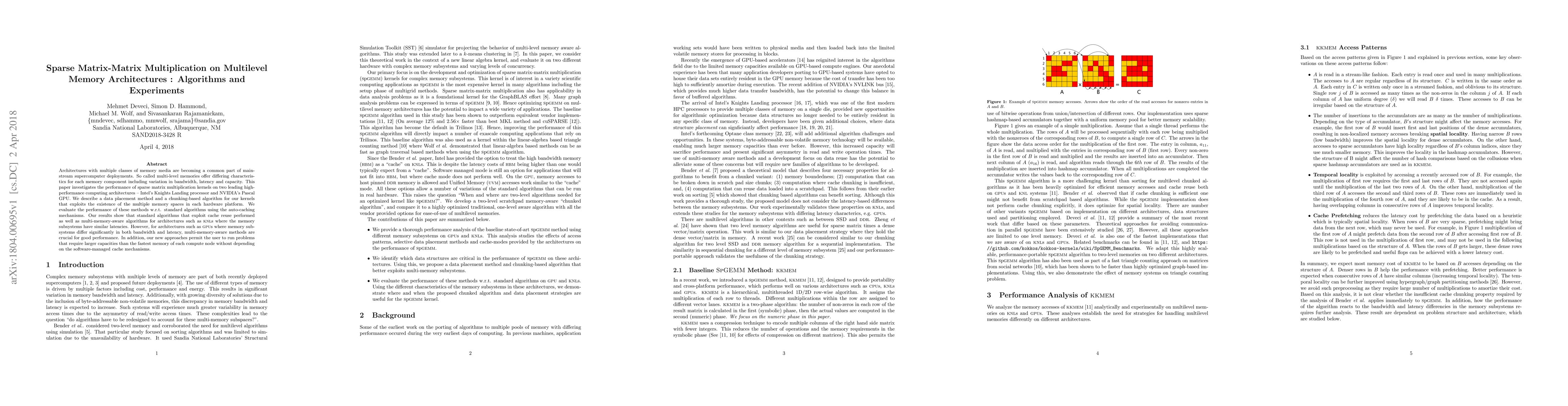 Architectures with multiple classes of memory media are becoming a common part of mainstream supercomputer deployments. So called multi-level memories offer differing characteristics for each memory component including variation in bandwidth, latency and capacity. This paper investigates the performance of sparse matrix multiplication kernels on two leading high-performance computing architectures -- Intel's Knights Landing processor and NVIDIA's Pascal GPU. We describe a data placement method and a chunking-based algorithm for our kernels that exploits the existence of the multiple memory spaces in each hardware platform. We evaluate the performance of these methods w.r.t. standard algorithms using the auto-caching mechanisms. Our results show that standard algorithms that exploit cache reuse performed as well as multi-memory-aware algorithms for architectures such as KNLs where the memory subsystems have similar latencies. However, for architectures such as GPUs where memory subsystems differ significantly in both bandwidth and latency, multi-memory-aware methods are crucial for good performance. In addition, our new approaches permit the user to run problems that require larger capacities than the fastest memory of each compute node without depending on the software-managed cache mechanisms.