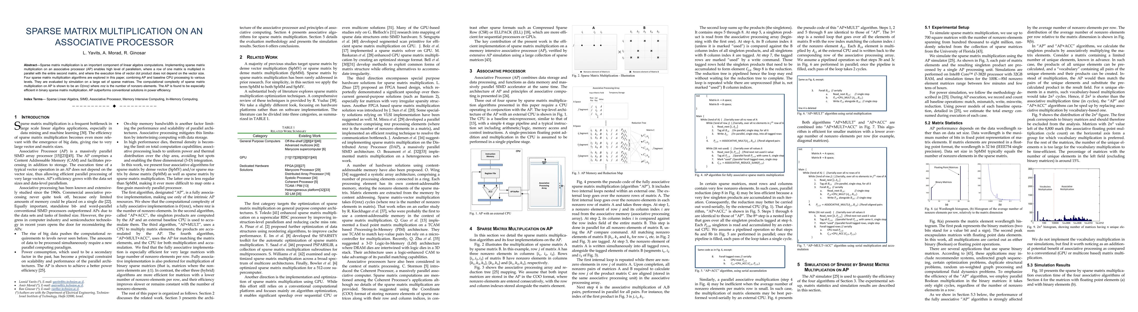 The paper explores four sparse matrix multiplication algorithms on an associative processor (AP), combining AP and baseline CPU processing to varying degrees. These algorithms are evaluated via simulation on a large set of sparse matrices from the University of Florida collection.