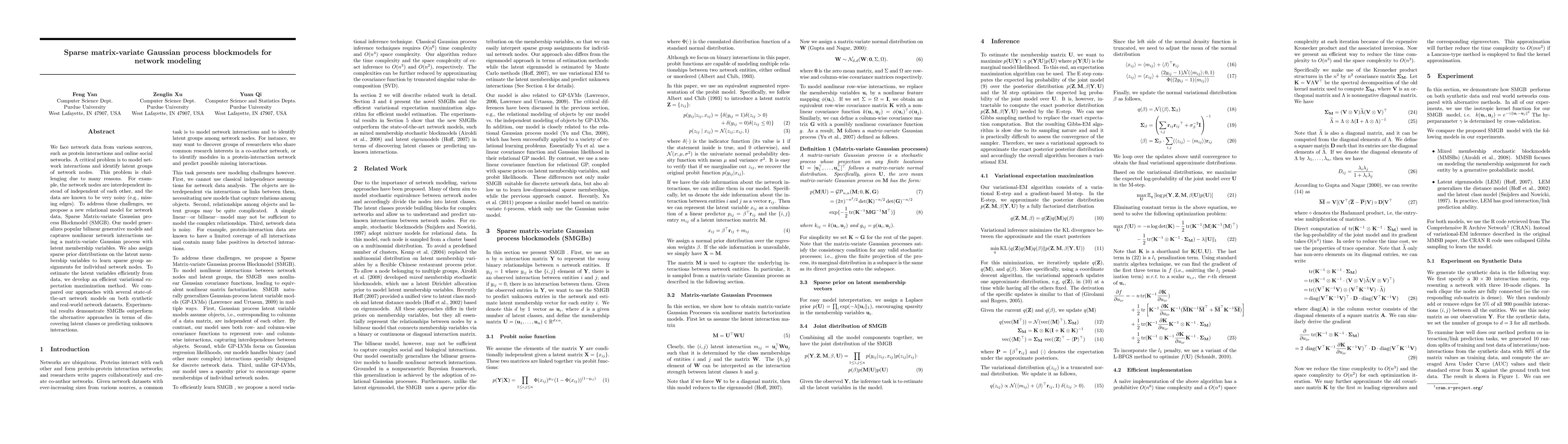 We face network data from various sources, such as protein interactions and online social networks. A critical problem is to model network interactions and identify latent groups of network nodes. This problem is challenging due to many reasons. For example, the network nodes are interdependent instead of independent of each other, and the data are known to be very noisy (e.g., missing edges). To address these challenges, we propose a new relational model for network data, Sparse Matrix-variate Gaussian process Blockmodel (SMGB). Our model generalizes popular bilinear generative models and captures nonlinear network interactions using a matrix-variate Gaussian process with latent membership variables. We also assign sparse prior distributions on the latent membership variables to learn sparse group assignments for individual network nodes. To estimate the latent variables efficiently from data, we develop an efficient variational expectation maximization method. We compared our approaches with several state-of-the-art network models on both synthetic and real-world network datasets. Experimental results demonstrate SMGBs outperform the alternative approaches in terms of discovering latent classes or predicting unknown interactions.