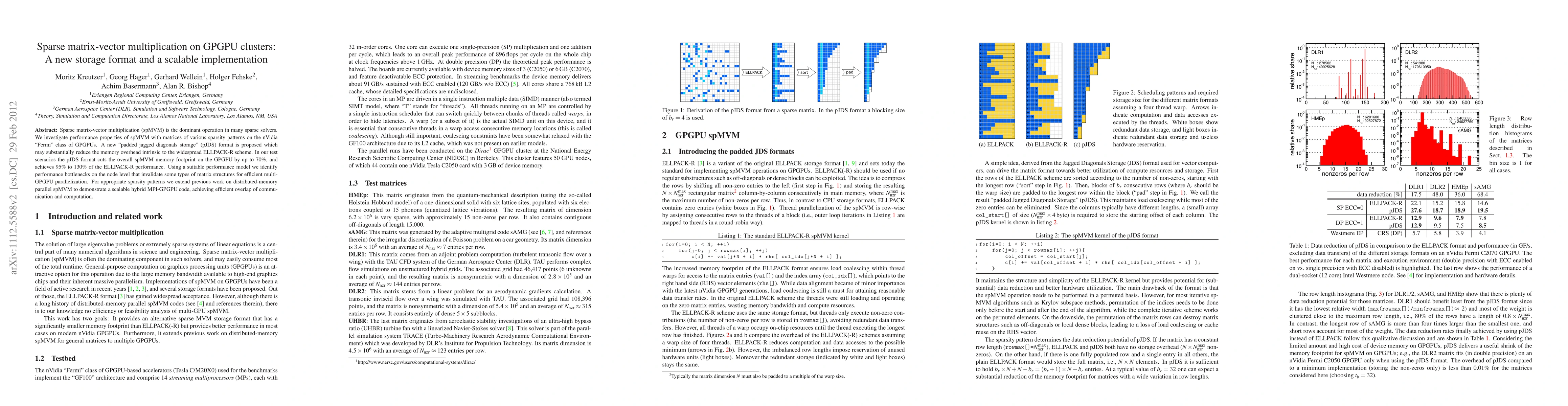 This paper proposes a new "padded jagged diagonals storage" (pJDS) format for sparse matrix-vector multiplication on GPGPU clusters, which reduces memory overhead by up to 70% compared to ELLPACK-R while maintaining performance. It also presents a scalable hybrid MPI-GPGPU implementation for efficient parallelization.