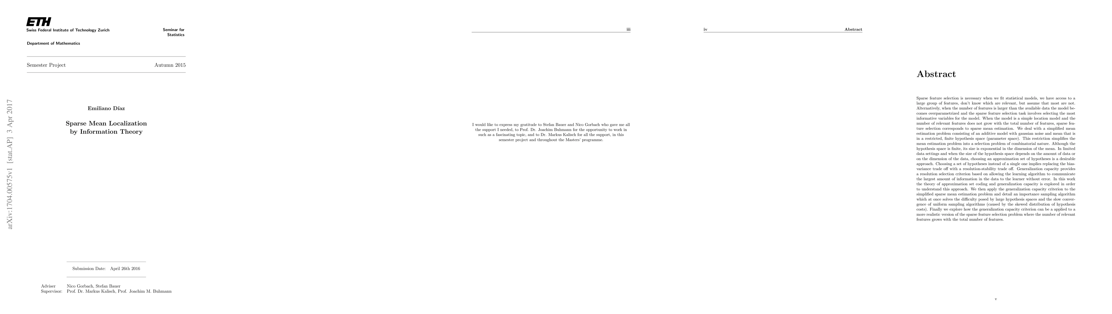Sparse feature selection is necessary when we fit statistical models, we have access to a large group of features, don't know which are relevant, but assume that most are not. Alternatively, when the number of features is larger than the available data the model becomes over parametrized and the sparse feature selection task involves selecting the most informative variables for the model. When the model is a simple location model and the number of relevant features does not grow with the total number of features, sparse feature selection corresponds to sparse mean estimation. We deal with a simplified mean estimation problem consisting of an additive model with gaussian noise and mean that is in a restricted, finite hypothesis space. This restriction simplifies the mean estimation problem into a selection problem of combinatorial nature. Although the hypothesis space is finite, its size is exponential in the dimension of the mean. In limited data settings and when the size of the hypothesis space depends on the amount of data or on the dimension of the data, choosing an approximation set of hypotheses is a desirable approach. Choosing a set of hypotheses instead of a single one implies replacing the bias-variance trade off with a resolution-stability trade off. Generalization capacity provides a resolution selection criterion based on allowing the learning algorithm to communicate the largest amount of information in the data to the learner without error. In this work the theory of approximation set coding and generalization capacity is explored in order to understand this approach. We then apply the generalization capacity criterion to the simplified sparse mean estimation problem and detail an importance sampling algorithm which at once solves the difficulty posed by large hypothesis spaces and the slow convergence of uniform sampling algorithms.