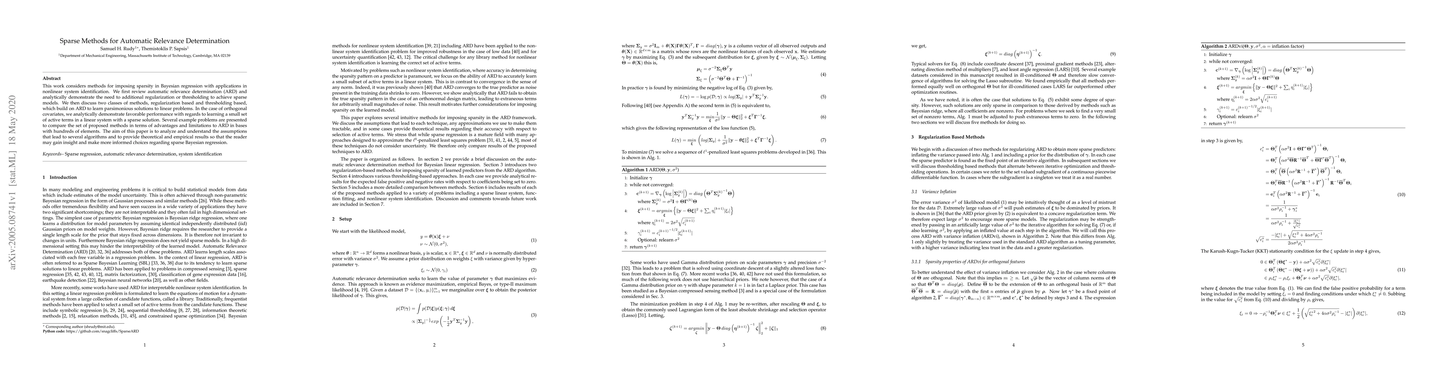 This paper reviews sparse methods for automatic relevance determination (ARD) in Bayesian regression, focusing on regularization and thresholding techniques to achieve parsimonious models. It demonstrates analytically and empirically the advantages of these methods over traditional ARD, particularly in identifying active terms in linear systems.