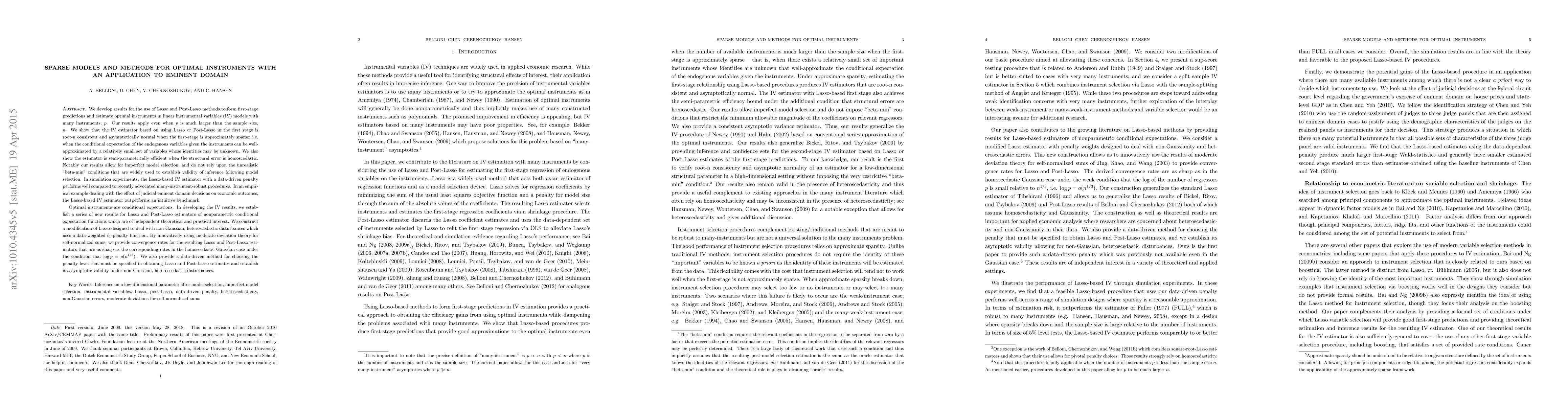 We develop results for the use of Lasso and Post-Lasso methods to form first-stage predictions and estimate optimal instruments in linear instrumental variables (IV) models with many instruments, $p$. Our results apply even when $p$ is much larger than the sample size, $n$. We show that the IV estimator based on using Lasso or Post-Lasso in the first stage is root-n consistent and asymptotically normal when the first-stage is approximately sparse; i.e. when the conditional expectation of the endogenous variables given the instruments can be well-approximated by a relatively small set of variables whose identities may be unknown. We also show the estimator is semi-parametrically efficient when the structural error is homoscedastic. Notably our results allow for imperfect model selection, and do not rely upon the unrealistic "beta-min" conditions that are widely used to establish validity of inference following model selection. In simulation experiments, the Lasso-based IV estimator with a data-driven penalty performs well compared to recently advocated many-instrument-robust procedures. In an empirical example dealing with the effect of judicial eminent domain decisions on economic outcomes, the Lasso-based IV estimator outperforms an intuitive benchmark. In developing the IV results, we establish a series of new results for Lasso and Post-Lasso estimators of nonparametric conditional expectation functions which are of independent theoretical and practical interest. We construct a modification of Lasso designed to deal with non-Gaussian, heteroscedastic disturbances which uses a data-weighted $\ell_1$-penalty function. Using moderate deviation theory for self-normalized sums, we provide convergence rates for the resulting Lasso and Post-Lasso estimators that are as sharp as the corresponding rates in the homoscedastic Gaussian case under the condition that $\log p = o(n^{1/3})$.