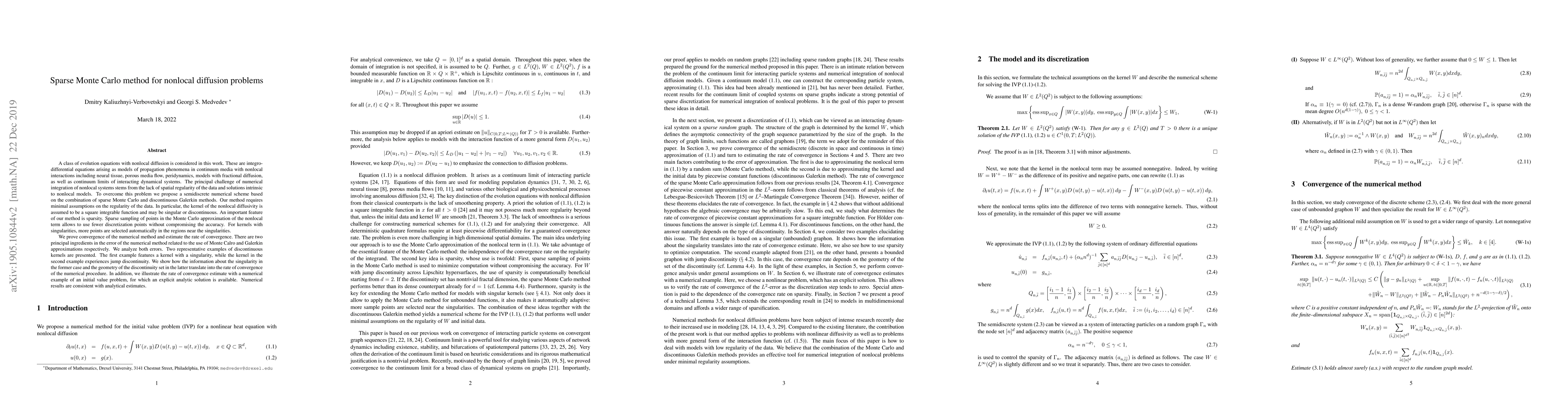 This paper proposes a sparse Monte Carlo method combined with discontinuous Galerkin methods to solve nonlocal diffusion problems, which are integro-differential equations with nonlocal interactions. The method leverages sparse sampling to maintain accuracy with fewer discretization points, and it proves convergence and estimates the convergence rate, analyzing errors from both Monte Carlo and Galerkin approximations.