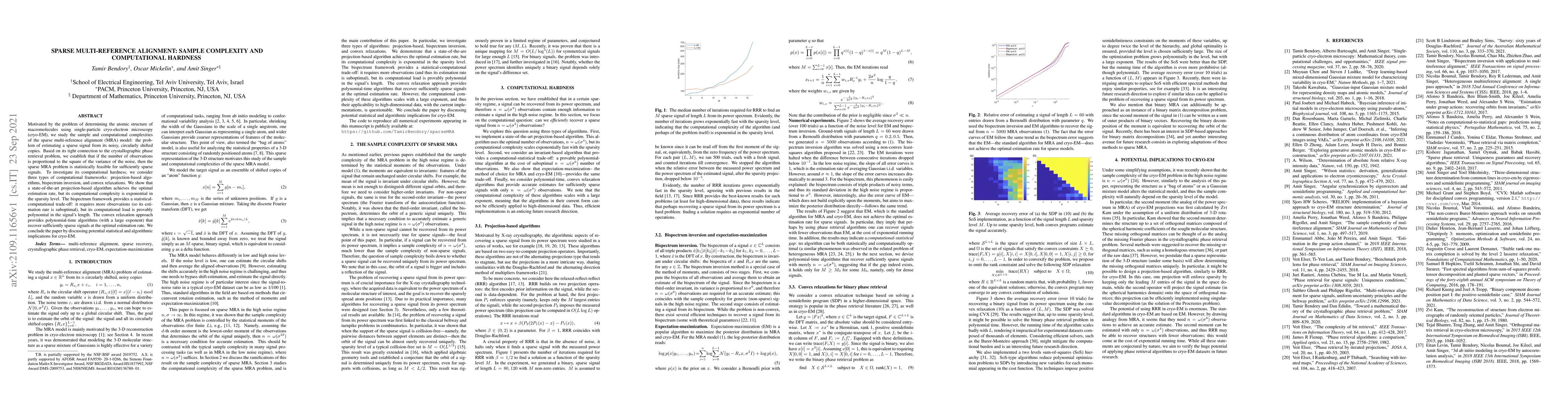 This paper investigates the sample complexity and computational hardness of sparse multi-reference alignment in cryo-electron microscopy, showing that while projection-based algorithms achieve optimal estimation, they are computationally intractable. The bispectrum framework offers a statistical-computational trade-off, while convex relaxations provide polynomial-time solutions at the cost of suboptimal estimation rates.