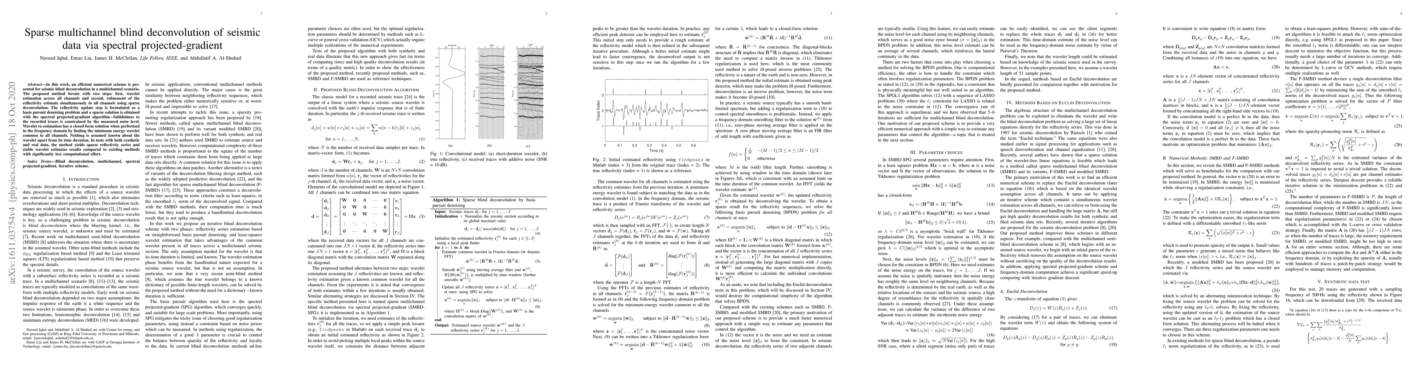 This paper proposes an efficient spectral projected-gradient method for sparse multichannel blind deconvolution of seismic data. It alternates between wavelet estimation and reflectivity refinement, achieving stable results with less computational effort compared to existing methods.