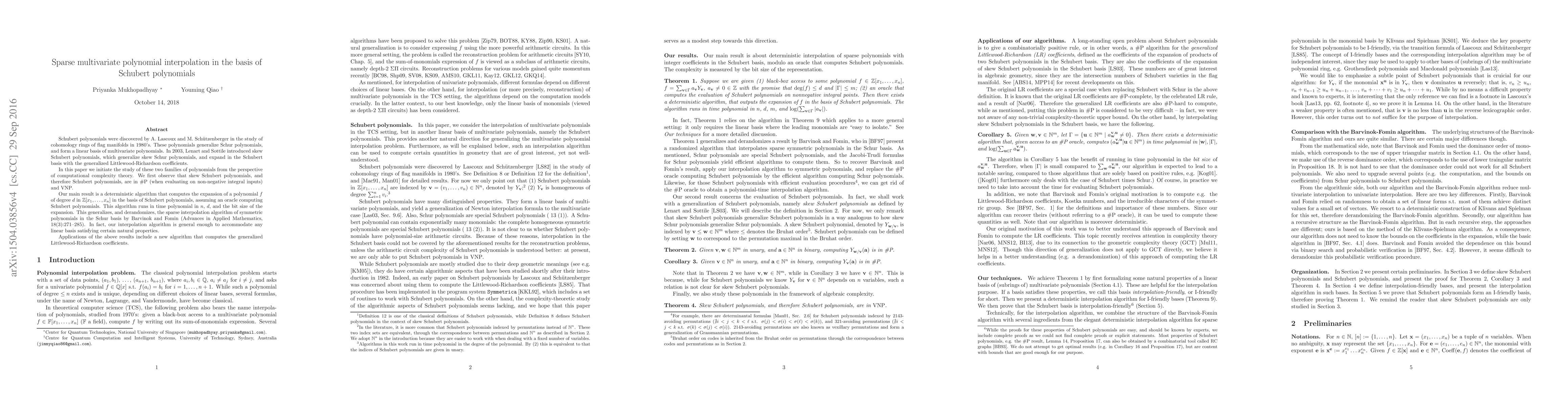 Schubert polynomials were discovered by A. Lascoux and M. Sch\"utzenberger in the study of cohomology rings of flag manifolds in 1980's. These polynomials generalize Schur polynomials, and form a linear basis of multivariate polynomials. In 2003, Lenart and Sottile introduced skew Schubert polynomials, which generalize skew Schur polynomials, and expand in the Schubert basis with the generalized Littlewood-Richardson coefficients. In this paper we initiate the study of these two families of polynomials from the perspective of computational complexity theory. We first observe that skew Schubert polynomials, and therefore Schubert polynomials, are in $\CountP$ (when evaluating on non-negative integral inputs) and $\VNP$. Our main result is a deterministic algorithm that computes the expansion of a polynomial $f$ of degree $d$ in $\Z[x_1, \dots, x_n]$ in the basis of Schubert polynomials, assuming an oracle computing Schubert polynomials. This algorithm runs in time polynomial in $n$, $d$, and the bit size of the expansion. This generalizes, and derandomizes, the sparse interpolation algorithm of symmetric polynomials in the Schur basis by Barvinok and Fomin (Advances in Applied Mathematics, 18(3):271--285). In fact, our interpolation algorithm is general enough to accommodate any linear basis satisfying certain natural properties. Applications of the above results include a new algorithm that computes the generalized Littlewood-Richardson coefficients.