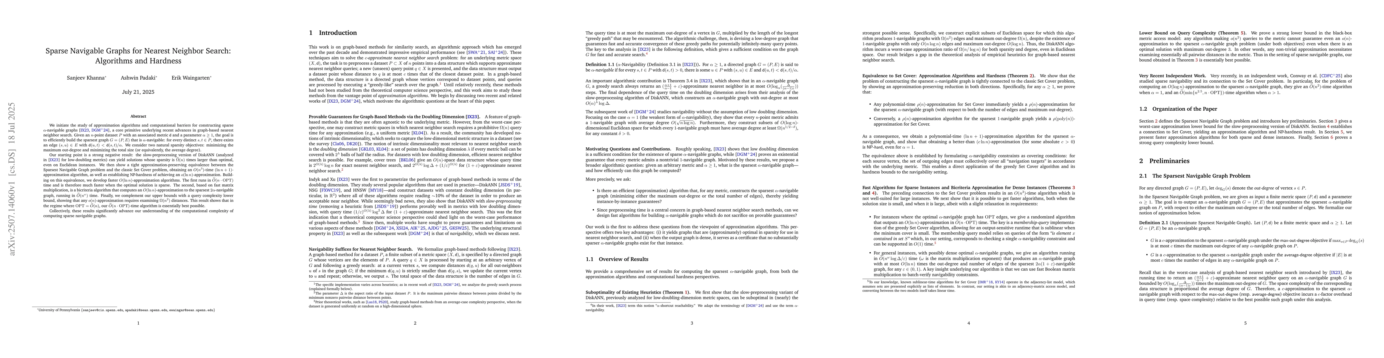 We initiate the study of approximation algorithms and computational barriers for constructing sparse $\alpha$-navigable graphs [IX23, DGM+24], a core primitive underlying recent advances in graph-based nearest neighbor search. Given an $n$-point dataset $P$ with an associated metric $\mathsf{d}$ and a parameter $\alpha \geq 1$, the goal is to efficiently build the sparsest graph $G=(P, E)$ that is $\alpha$-navigable: for every distinct $s, t \in P$, there exists an edge $(s, u) \in E$ with $\mathsf{d}(u, t) < \mathsf{d}(s, t)/\alpha$. We consider two natural sparsity objectives: minimizing the maximum out-degree and minimizing the total size. We first show a strong negative result: the slow-preprocessing version of DiskANN (analyzed in [IX23] for low-doubling metrics) can yield solutions whose sparsity is $\widetilde{\Omega}(n)$ times larger than optimal, even on Euclidean instances. We then show a tight approximation-preserving equivalence between the Sparsest Navigable Graph problem and the classic Set Cover problem, obtaining an $O(n^3)$-time $(\ln n + 1)$-approximation algorithm, as well as establishing NP-hardness of achieving an $o(\ln n)$-approximation. Building on this equivalence, we develop faster $O(\ln n)$-approximation algorithms. The first runs in $\widetilde{O}(n \cdot \mathrm{OPT})$ time and is thus much faster when the optimal solution is sparse. The second, based on fast matrix multiplication, is a bicriteria algorithm that computes an $O(\ln n)$-approximation to the sparsest $2\alpha$-navigable graph, running in $\widetilde{O}(n^{\omega})$ time. Finally, we complement our upper bounds with a query complexity lower bound, showing that any $o(n)$-approximation requires examining $\Omega(n^2)$ distances. This result shows that in the regime where $\mathrm{OPT} = \widetilde{O}(n)$, our $\widetilde{O}(n \cdot \mathrm{OPT})$-time algorithm is essentially best possible.