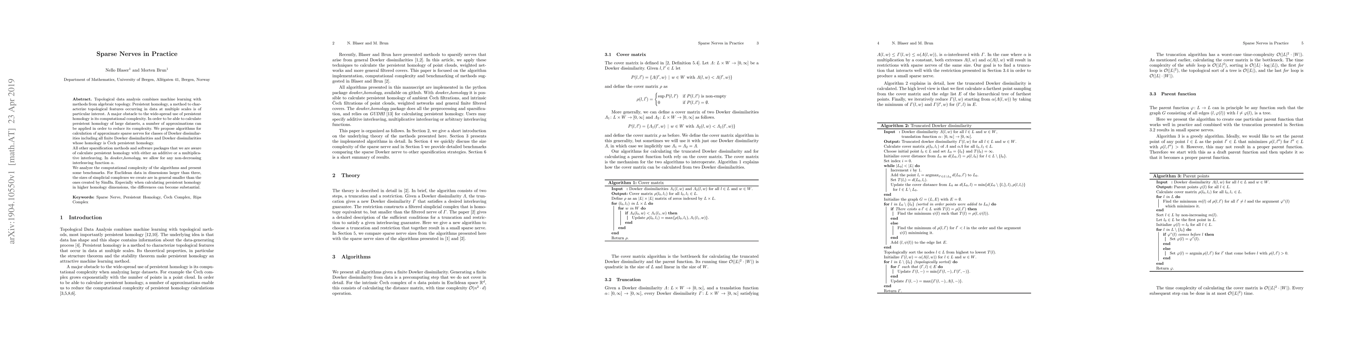 The paper 'Sparse Nerves in Practice' introduces algorithms for calculating approximate sparse nerves for specific Dowker dissimilarity classes, reducing computational complexity in persistent homology calculations. It allows for any non-decreasing interleaving function, unlike existing methods using additive or multiplicative interleaving. The method demonstrates smaller simplicial complex sizes for Euclidean data in dimensions greater than three, especially in higher homology dimensions, compared to SimBa.