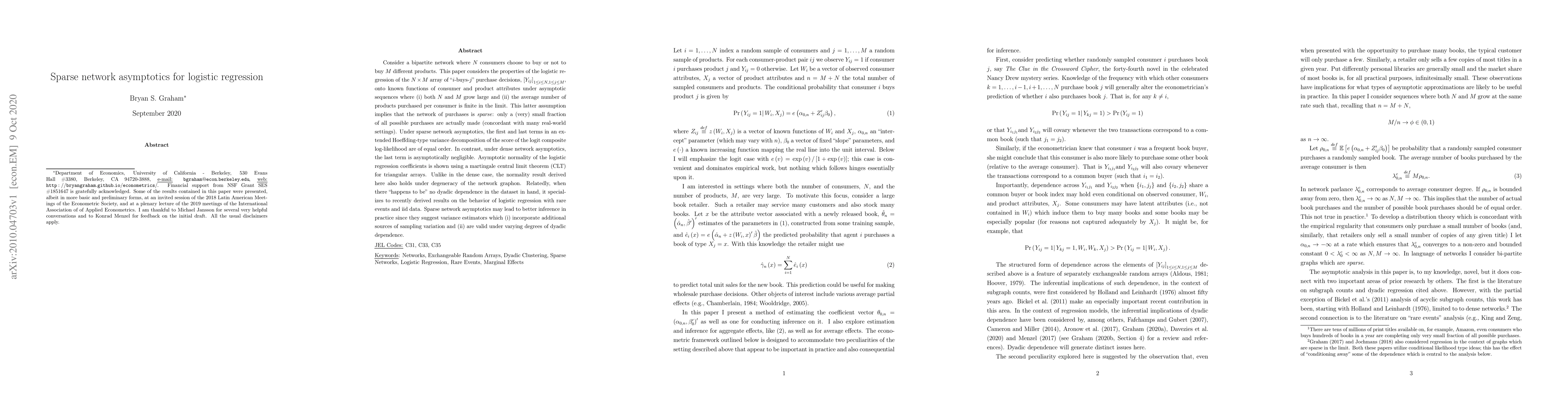 Consider a bipartite network where $N$ consumers choose to buy or not to buy $M$ different products. This paper considers the properties of the logistic regression of the $N\times M$ array of i-buys-j purchase decisions, $\left[Y_{ij}\right]_{1\leq i\leq N,1\leq j\leq M}$, onto known functions of consumer and product attributes under asymptotic sequences where (i) both $N$ and $M$ grow large and (ii) the average number of products purchased per consumer is finite in the limit. This latter assumption implies that the network of purchases is sparse: only a (very) small fraction of all possible purchases are actually made (concordant with many real-world settings). Under sparse network asymptotics, the first and last terms in an extended Hoeffding-type variance decomposition of the score of the logit composite log-likelihood are of equal order. In contrast, under dense network asymptotics, the last term is asymptotically negligible. Asymptotic normality of the logistic regression coefficients is shown using a martingale central limit theorem (CLT) for triangular arrays. Unlike in the dense case, the normality result derived here also holds under degeneracy of the network graphon. Relatedly, when there happens to be no dyadic dependence in the dataset in hand, it specializes to recently derived results on the behavior of logistic regression with rare events and iid data. Sparse network asymptotics may lead to better inference in practice since they suggest variance estimators which (i) incorporate additional sources of sampling variation and (ii) are valid under varying degrees of dyadic dependence.