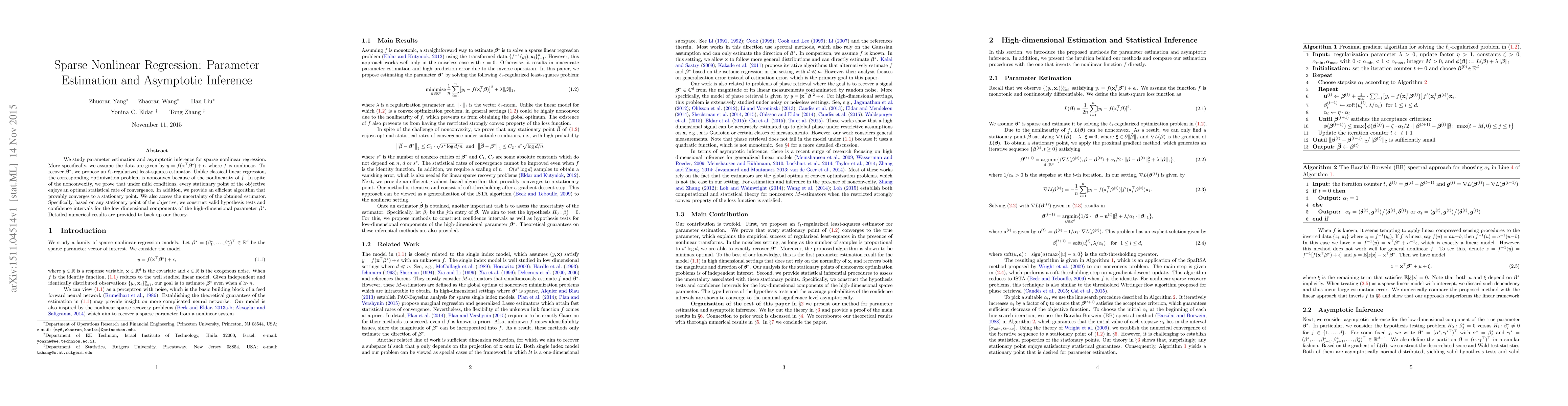 We study parameter estimation and asymptotic inference for sparse nonlinear regression. More specifically, we assume the data are given by $y = f( x^\top \beta^* ) + \epsilon$, where $f$ is nonlinear. To recover $\beta^*$, we propose an $\ell_1$-regularized least-squares estimator. Unlike classical linear regression, the corresponding optimization problem is nonconvex because of the nonlinearity of $f$. In spite of the nonconvexity, we prove that under mild conditions, every stationary point of the objective enjoys an optimal statistical rate of convergence. In addition, we provide an efficient algorithm that provably converges to a stationary point. We also access the uncertainty of the obtained estimator. Specifically, based on any stationary point of the objective, we construct valid hypothesis tests and confidence intervals for the low dimensional components of the high-dimensional parameter $\beta^*$. Detailed numerical results are provided to back up our theory.