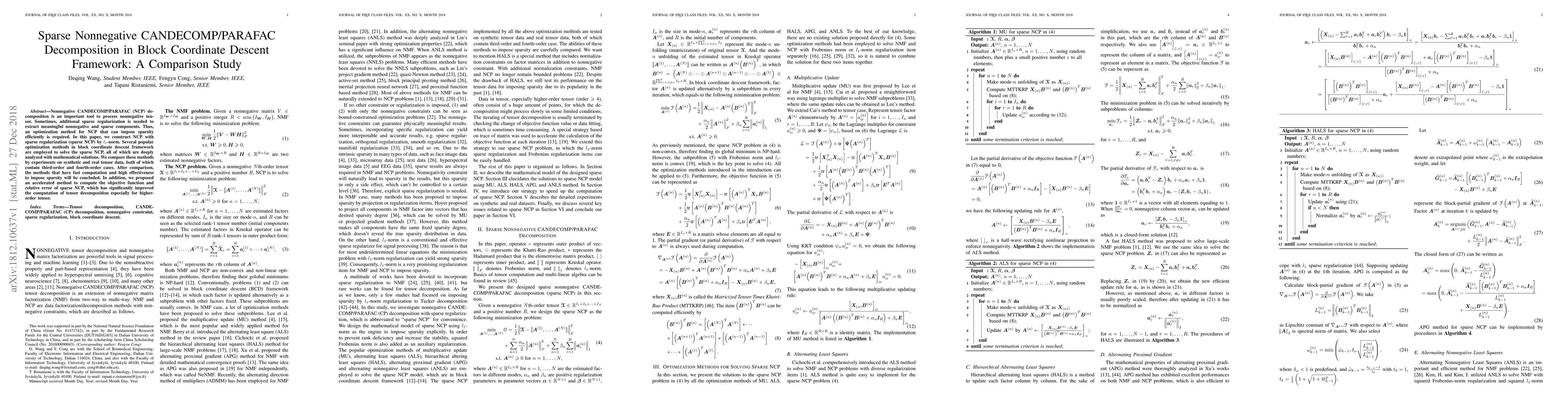 This paper constructs sparse nonnegative CANDECOMP/PARAFAC decomposition (sparse NCP) using l1-norm regularization and compares various optimization methods within a block coordinate descent framework for solving it. The methods are evaluated on synthetic and real tensor data, with a focus on computational speed and effectiveness in imposing sparsity.