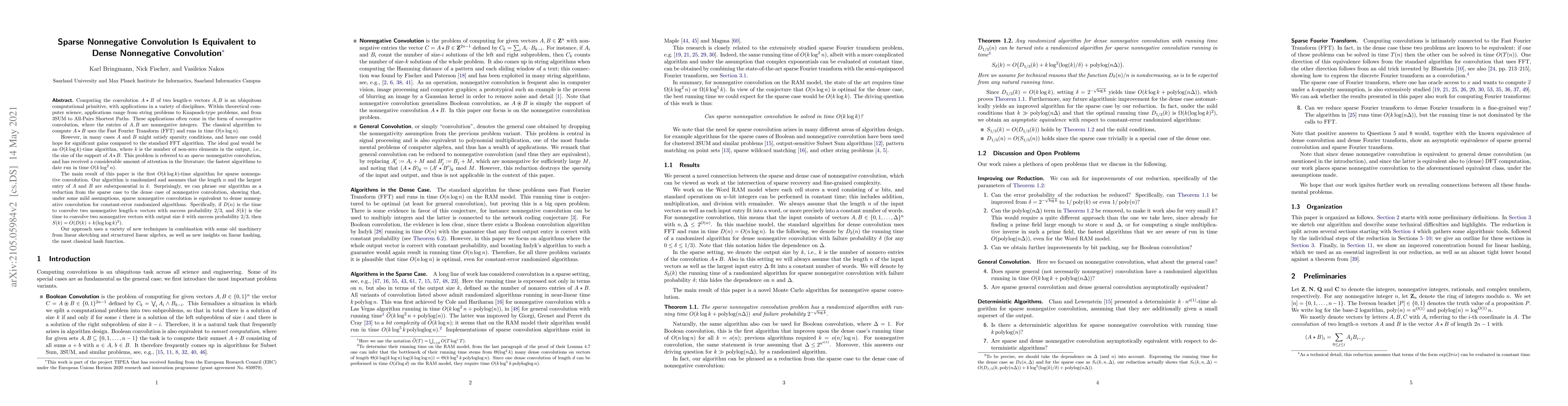The paper introduces a novel reduction between sparse and dense nonnegative convolution, enabling an $O(k\log k)$-time algorithm for sparse nonnegative convolution through a combination of linear sketching, structured linear algebra, and linear hashing insights.