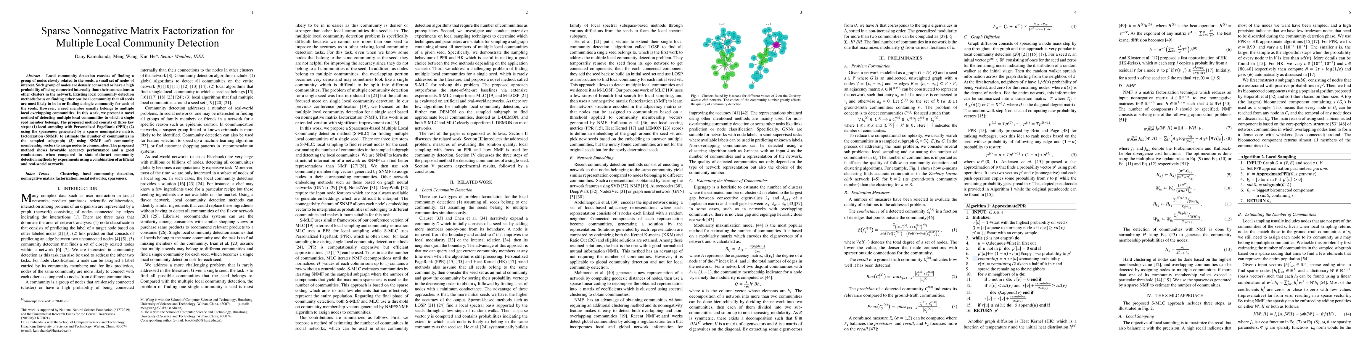 This paper proposes a novel method for detecting multiple local overlapping communities to which a single seed node belongs using sparse nonnegative matrix factorization (SNMF). The method involves local sampling with Personalized PageRank, estimating community numbers via SNMF, and assigning nodes based on SNMF soft membership vectors, demonstrating improved accuracy and conductance compared to existing methods.