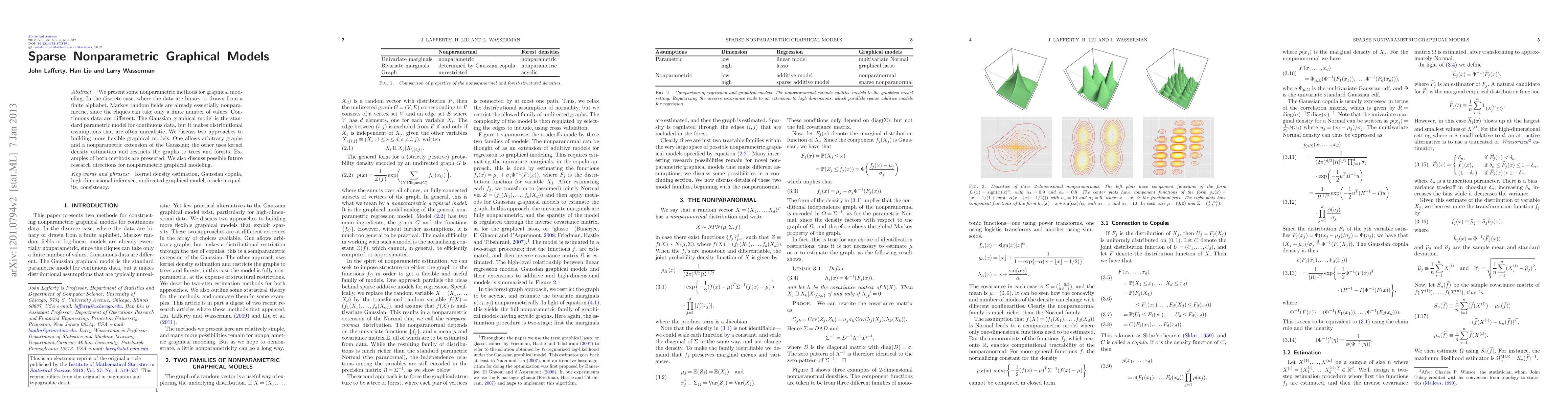 We present some nonparametric methods for graphical modeling. In the discrete case, where the data are binary or drawn from a finite alphabet, Markov random fields are already essentially nonparametric, since the cliques can take only a finite number of values. Continuous data are different. The Gaussian graphical model is the standard parametric model for continuous data, but it makes distributional assumptions that are often unrealistic. We discuss two approaches to building more flexible graphical models. One allows arbitrary graphs and a nonparametric extension of the Gaussian; the other uses kernel density estimation and restricts the graphs to trees and forests. Examples of both methods are presented. We also discuss possible future research directions for nonparametric graphical modeling.