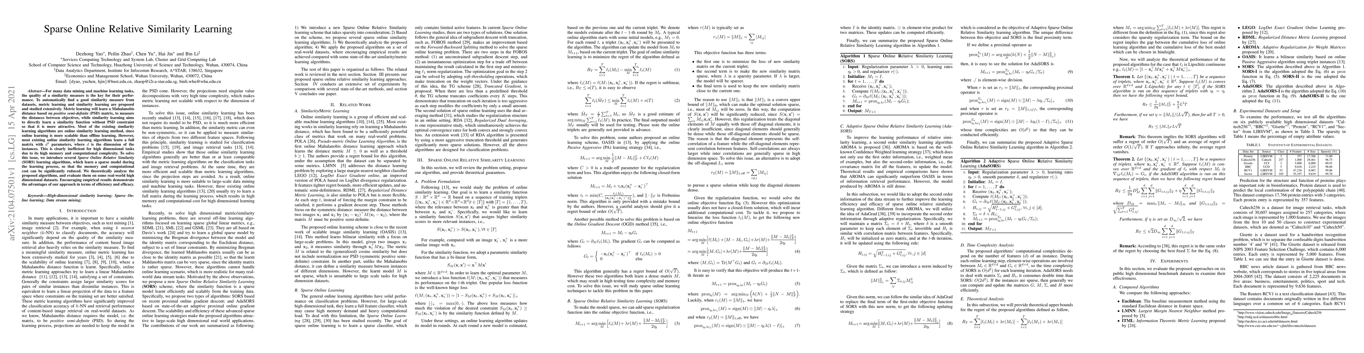 For many data mining and machine learning tasks, the quality of a similarity measure is the key for their performance. To automatically find a good similarity measure from datasets, metric learning and similarity learning are proposed and studied extensively. Metric learning will learn a Mahalanobis distance based on positive semi-definite (PSD) matrix, to measure the distances between objectives, while similarity learning aims to directly learn a similarity function without PSD constraint so that it is more attractive. Most of the existing similarity learning algorithms are online similarity learning method, since online learning is more scalable than offline learning. However, most existing online similarity learning algorithms learn a full matrix with d 2 parameters, where d is the dimension of the instances. This is clearly inefficient for high dimensional tasks due to its high memory and computational complexity. To solve this issue, we introduce several Sparse Online Relative Similarity (SORS) learning algorithms, which learn a sparse model during the learning process, so that the memory and computational cost can be significantly reduced. We theoretically analyze the proposed algorithms, and evaluate them on some real-world high dimensional datasets. Encouraging empirical results demonstrate the advantages of our approach in terms of efficiency and efficacy.