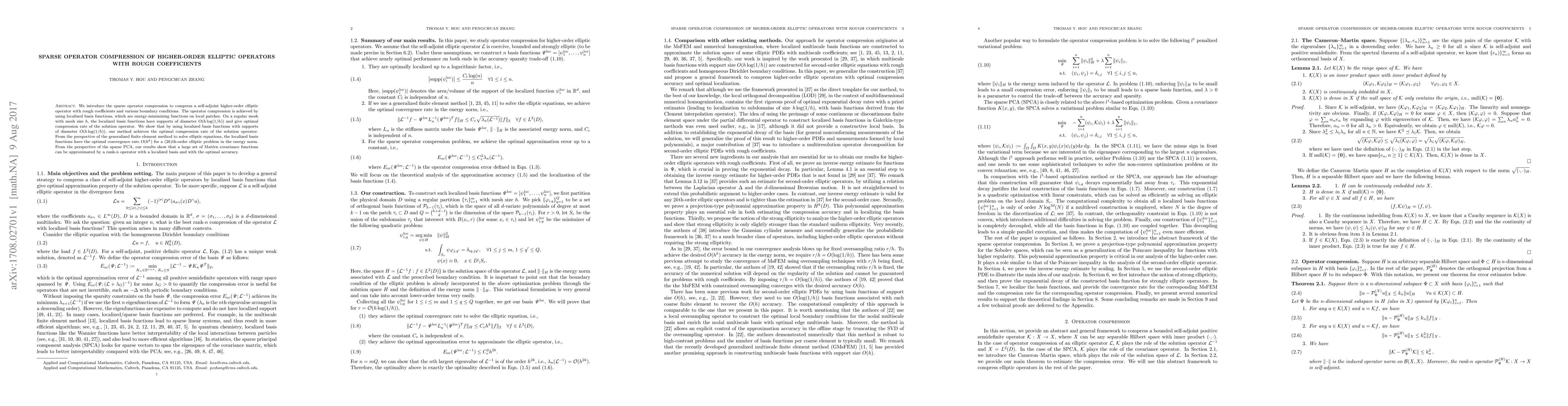 We introduce the sparse operator compression to compress a self-adjoint higher-order elliptic operator with rough coefficients and various boundary conditions. The operator compression is achieved by using localized basis functions, which are energy-minimizing functions on local patches. On a regular mesh with mesh size $h$, the localized basis functions have supports of diameter $O(h\log(1/h))$ and give optimal compression rate of the solution operator. We show that by using localized basis functions with supports of diameter $O(h\log(1/h))$, our method achieves the optimal compression rate of the solution operator. From the perspective of the generalized finite element method to solve elliptic equations, the localized basis functions have the optimal convergence rate $O(h^k)$ for a $(2k)$th-order elliptic problem in the energy norm. From the perspective of the sparse PCA, our results show that a large set of Mat\'{e}rn covariance functions can be approximated by a rank-$n$ operator with a localized basis and with the optimal accuracy.