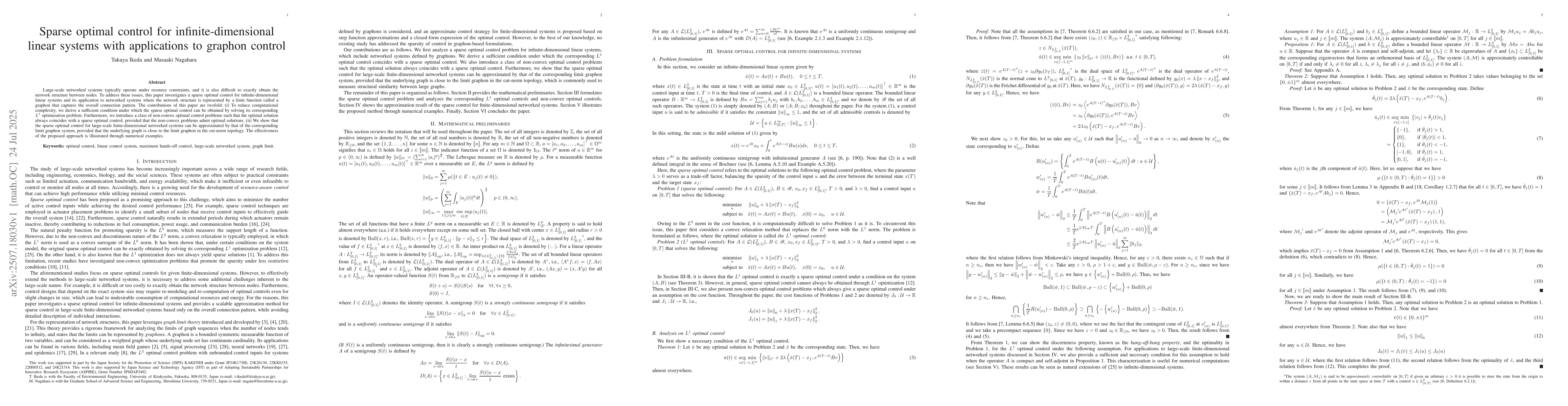 Large-scale networked systems typically operate under resource constraints, and it is also difficult to exactly obtain the network structure between nodes. To address these issues, this paper investigates a sparse optimal control for infinite-dimensional linear systems and its application to networked systems where the network structure is represented by a limit function called a graphon that captures the overall connection pattern. The contributions of this paper are twofold: (i) To reduce computational complexity, we derive a sufficient condition under which the sparse optimal control can be obtained by solving its corresponding L1 optimization problem. Furthermore, we introduce a class of non-convex optimal control problems such that the optimal solution always coincides with a sparse optimal control, provided that the non-convex problems admit optimal solutions. (ii) We show that the sparse optimal control for large-scale finite-dimensional networked systems can be approximated by that of the corresponding limit graphon system, provided that the underlying graph is close to the limit graphon in the cut-norm topology. The effectiveness of the proposed approach is illustrated through numerical examples.
