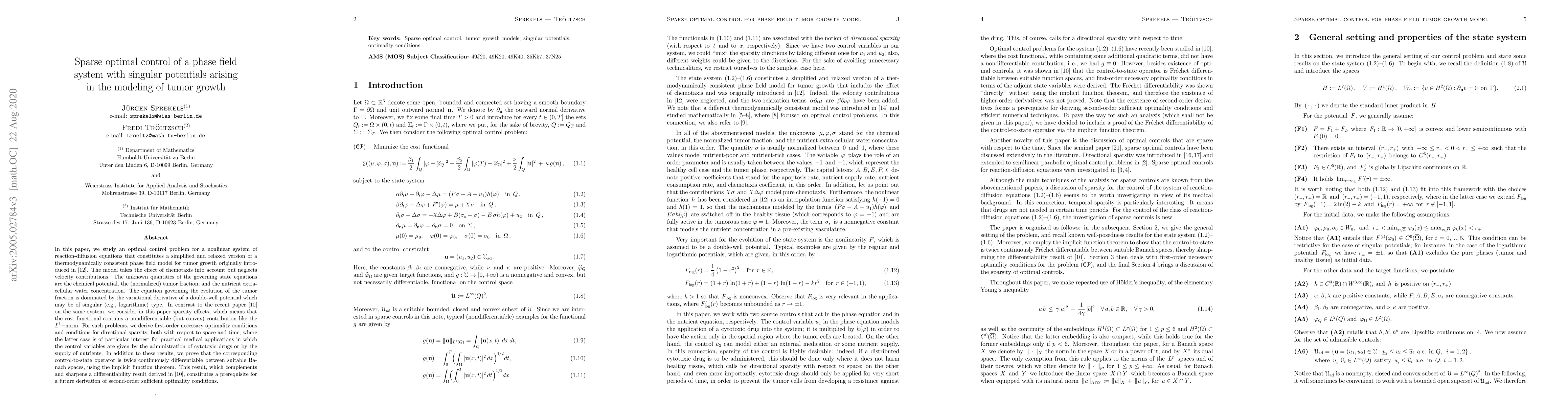 Researchers studied optimal control of a phase field system modeling tumor growth, introducing $L^1$-norm sparsity to tackle practical medical applications. They derived necessary optimality conditions and showed the control-to-state operator is twice continuously differentiable.