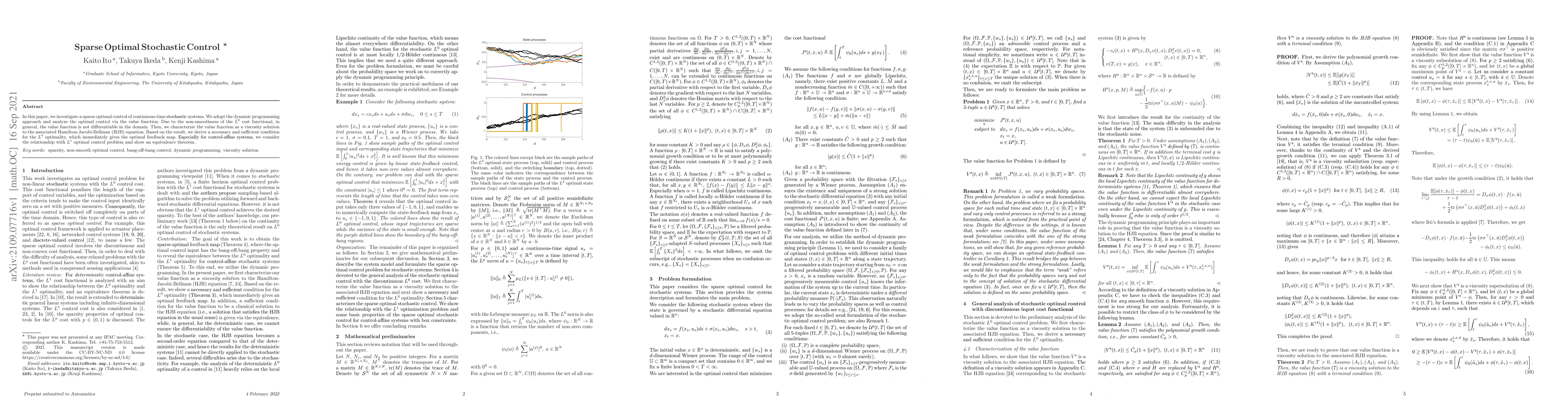 This paper explores sparse optimal control for continuous-time stochastic systems using dynamic programming and the value function. It characterizes the value function as a viscosity solution to the Hamilton-Jacobi-Bellman equation, deriving necessary and sufficient conditions for $L^0$ optimality and establishing an equivalence theorem with $L^1$ optimal control for control-affine systems.