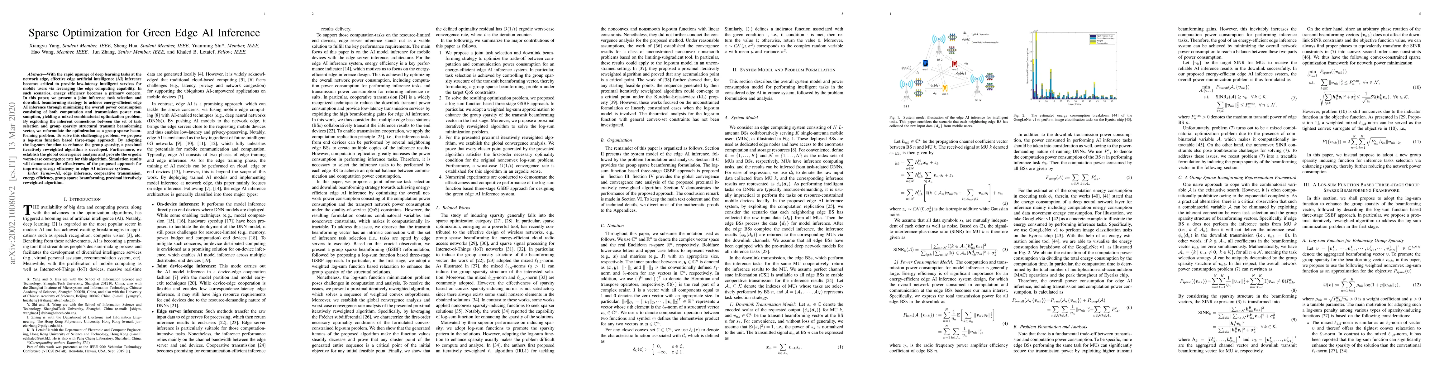 This paper proposes a joint task selection and downlink beamforming strategy for energy-efficient edge AI inference, reformulating the optimization problem as a group sparse beamforming issue. The authors introduce a log-sum function-based three-stage approach, including a proximal iteratively reweighted algorithm, to solve the problem and demonstrate improved energy efficiency through simulations.