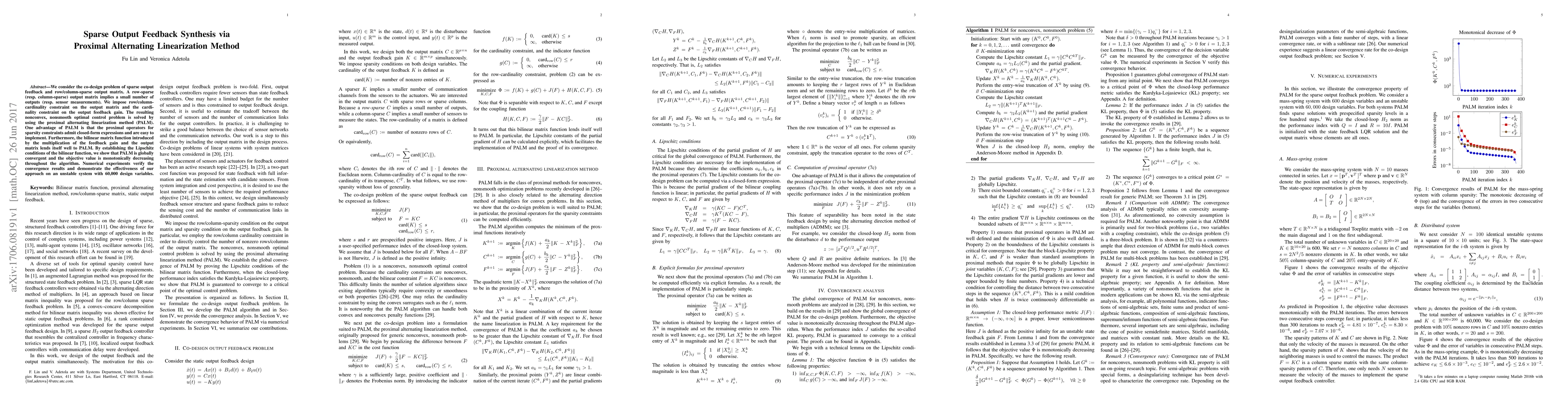 This paper proposes a method for synthesizing sparse output feedback with row/column-sparse output matrices using the proximal alternating linearization method (PALM). PALM is shown to be globally convergent and effective, as demonstrated by numerical experiments on an unstable system with 60,000 design variables.