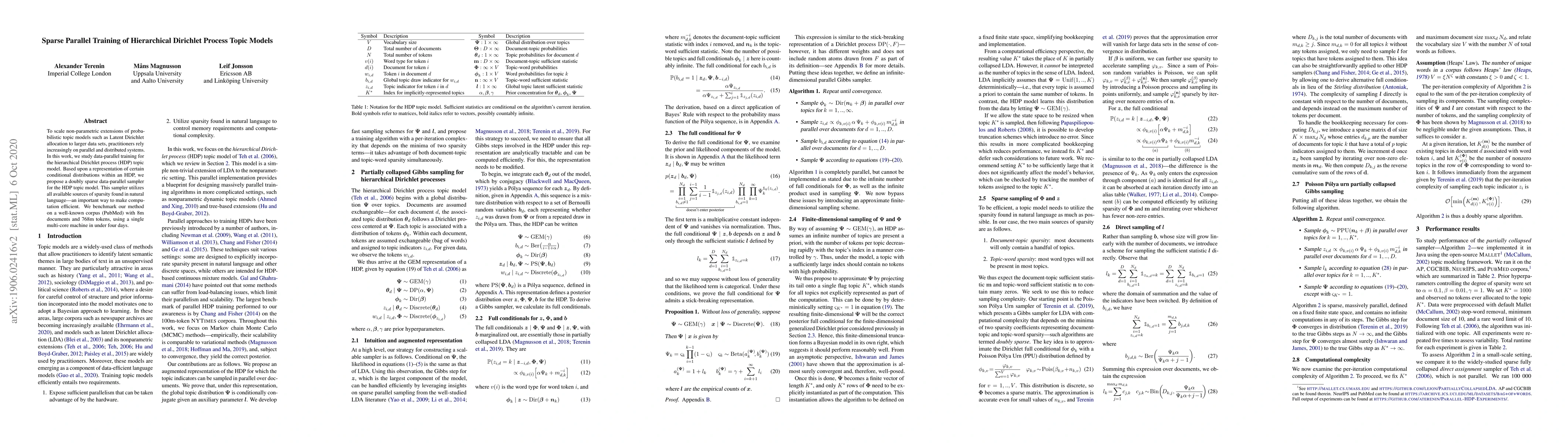 This paper proposes a doubly sparse data-parallel sampler for training hierarchical Dirichlet process (HDP) topic models, leveraging natural language sparsity to improve computational efficiency. The method is benchmarked on a large corpus (PubMed) and successfully scales to 8 million documents and 768 million tokens using a single multi-core machine.