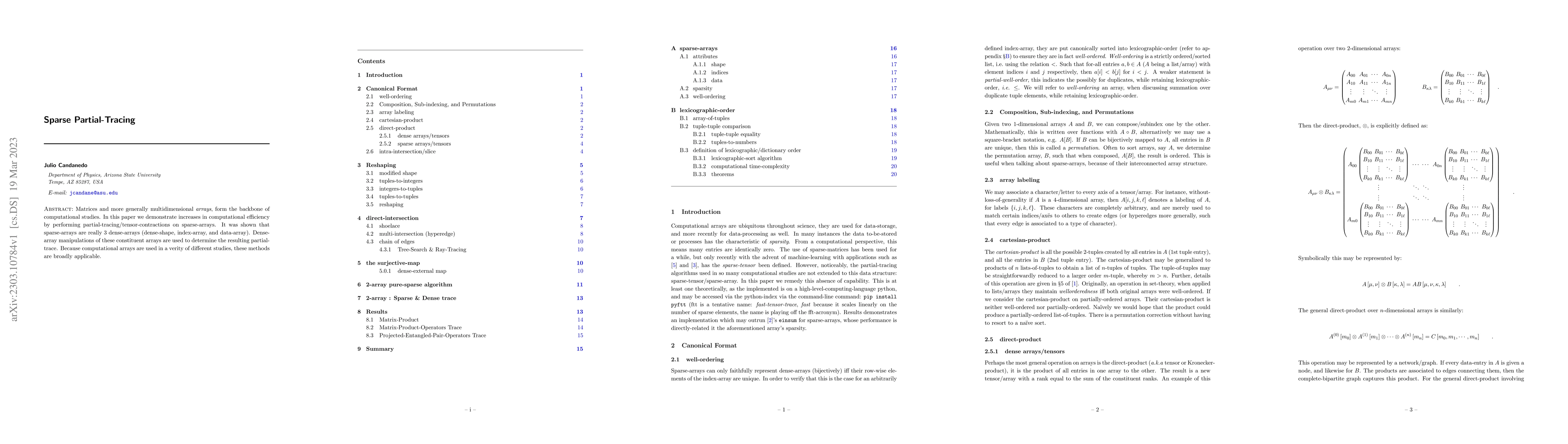 This paper proposes a method to enhance computational efficiency by performing partial-tracing on sparse arrays, which are decomposed into three dense arrays. The resulting partial-trace is determined through dense-array manipulations, offering broad applicability across various computational studies.