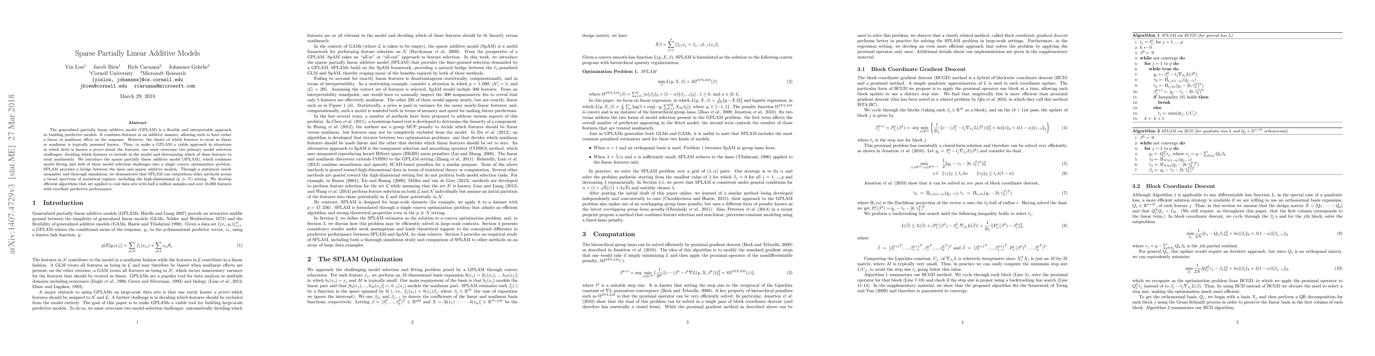 The sparse partially linear additive model (SPLAM) integrates model selection and fitting into a single convex optimization problem, addressing both feature inclusion and nonlinearity determination. SPLAM outperforms other methods in various statistical contexts, including high-dimensional settings, and demonstrates excellent predictive performance on large datasets.