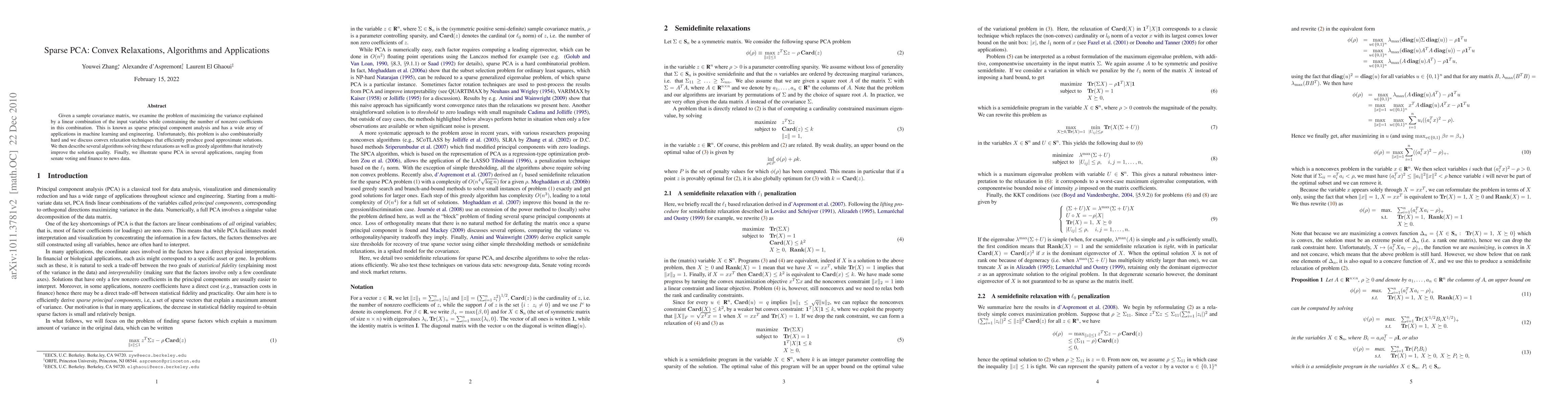 This paper explores sparse principal component analysis (PCA) to maximize variance while limiting coefficients, addressing its combinatorial complexity through convex relaxations. It proposes efficient algorithms for solving these relaxations and demonstrates their application in various fields like finance and political data analysis.