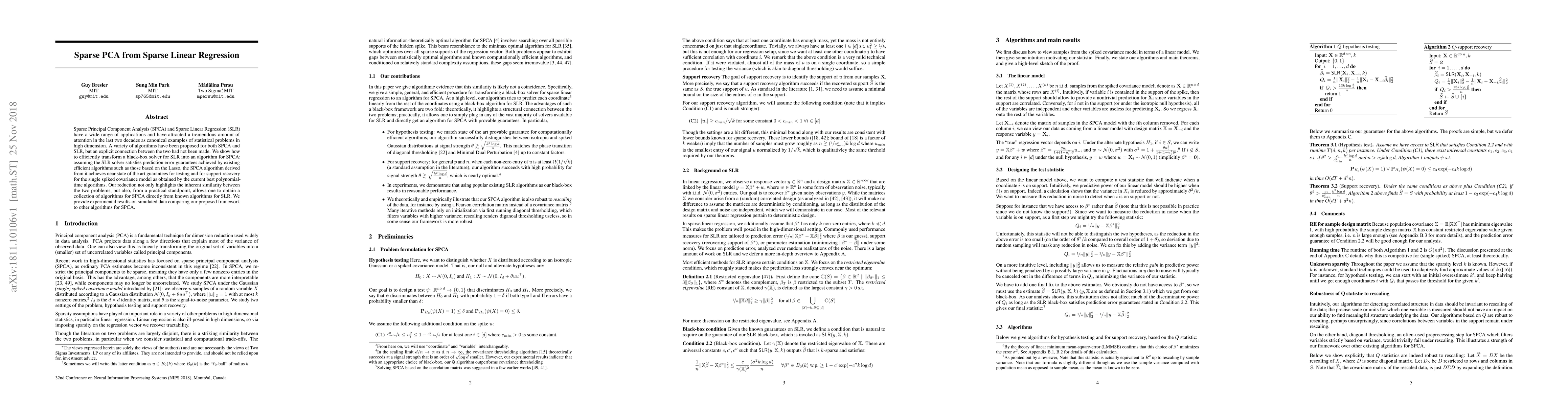 This paper establishes a connection between Sparse Linear Regression and Sparse Principal Component Analysis, demonstrating how to transform an SLR solver into an efficient SPCA algorithm. The proposed method achieves near state-of-the-art performance for testing and support recovery, leveraging existing SLR algorithms.