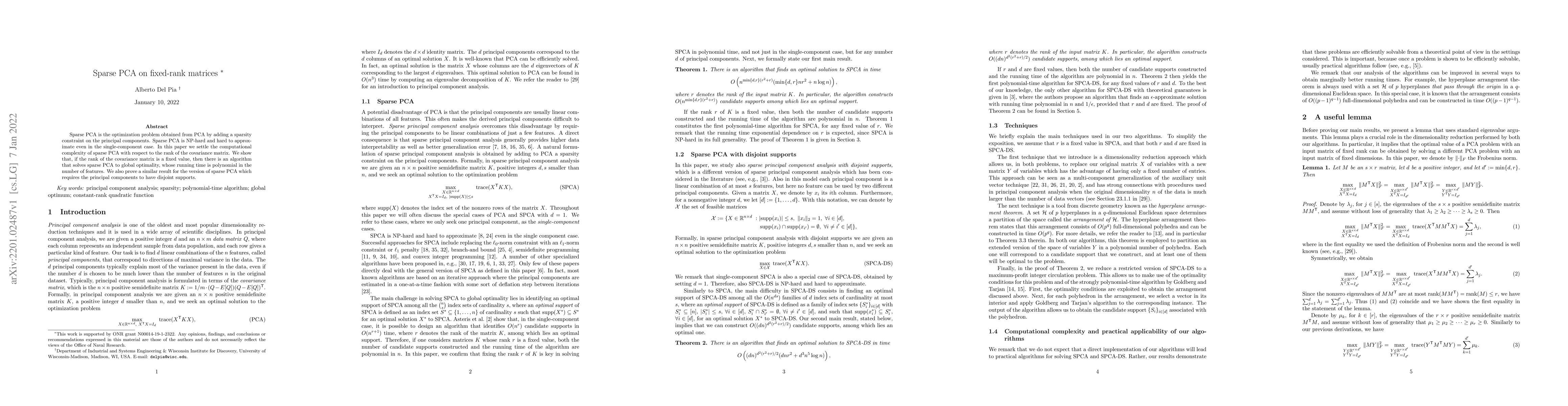 This paper addresses the computational complexity of sparse PCA when the rank of the covariance matrix is fixed. It presents an algorithm that solves sparse PCA optimally in polynomial time, and also proves a similar result for sparse PCA with disjoint principal component supports.
