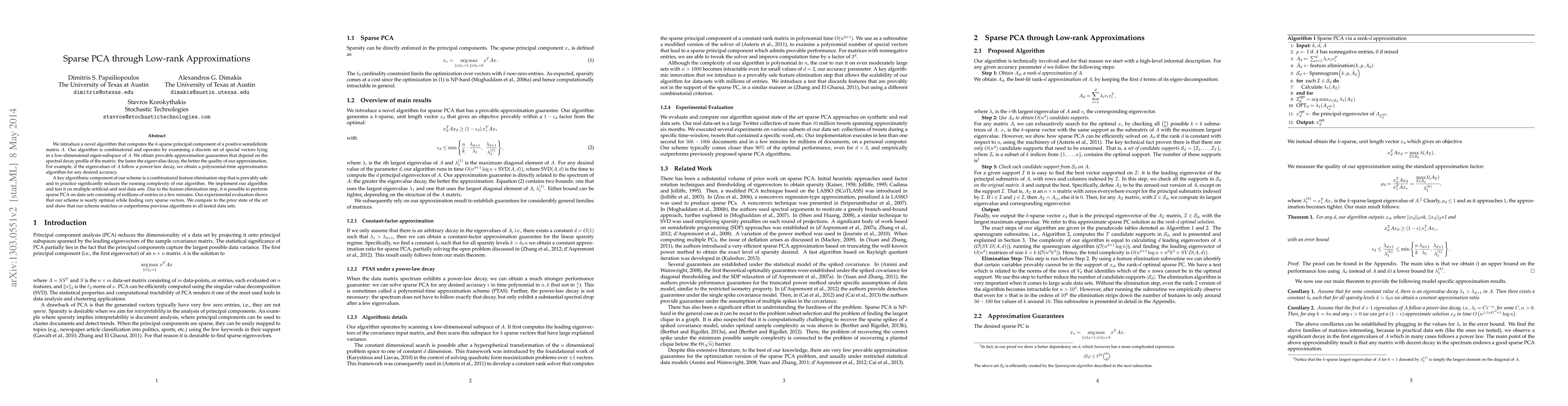 A novel algorithm for sparse PCA uses a combinatorial feature elimination step to quickly approximate k-sparse principal components of positive semidefinite matrices, achieving nearly optimal results with significant time complexity reduction.