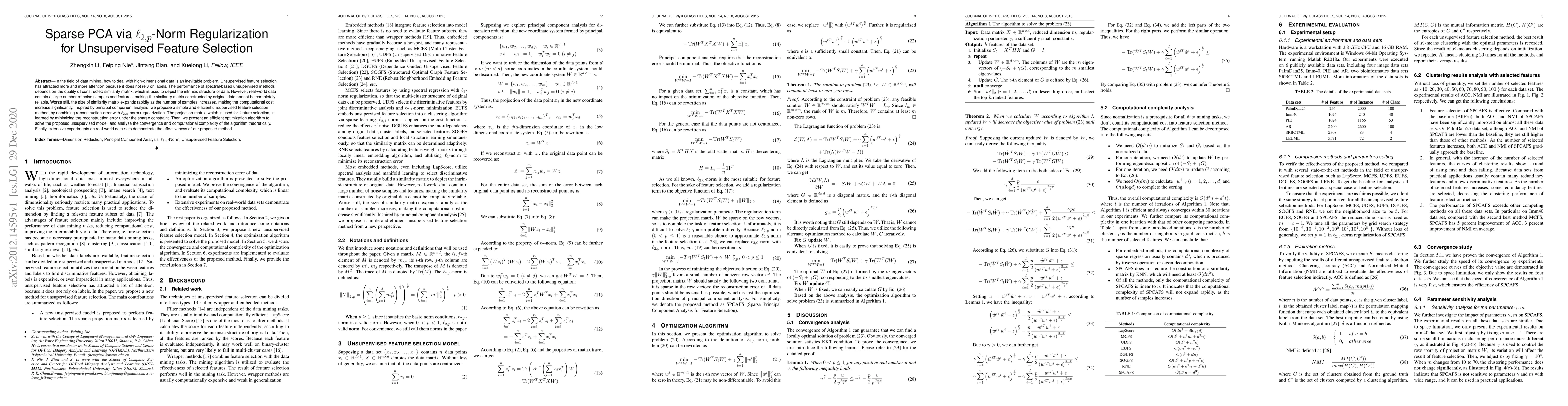 This paper proposes a sparse PCA method using $l_{2,p}$-norm regularization for unsupervised feature selection, aiming to address high-dimensional data challenges. The method minimizes reconstruction error under sparse constraints to select features, and an efficient optimization algorithm is developed to solve the model, demonstrating effectiveness through experiments on real-world datasets.